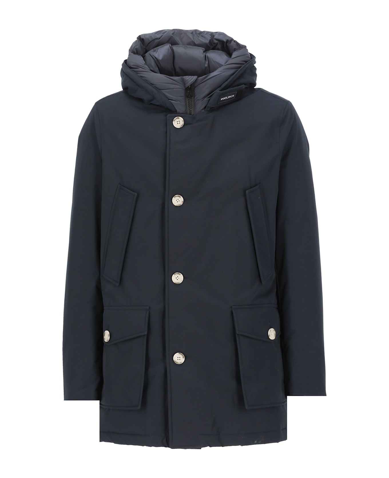 - Black Woolrich cotton blend parka for man - Hood with logo - Long sleeves - Two front slit pockets - Two front welt pockets with snap buttons - Front zip and buttons fastening