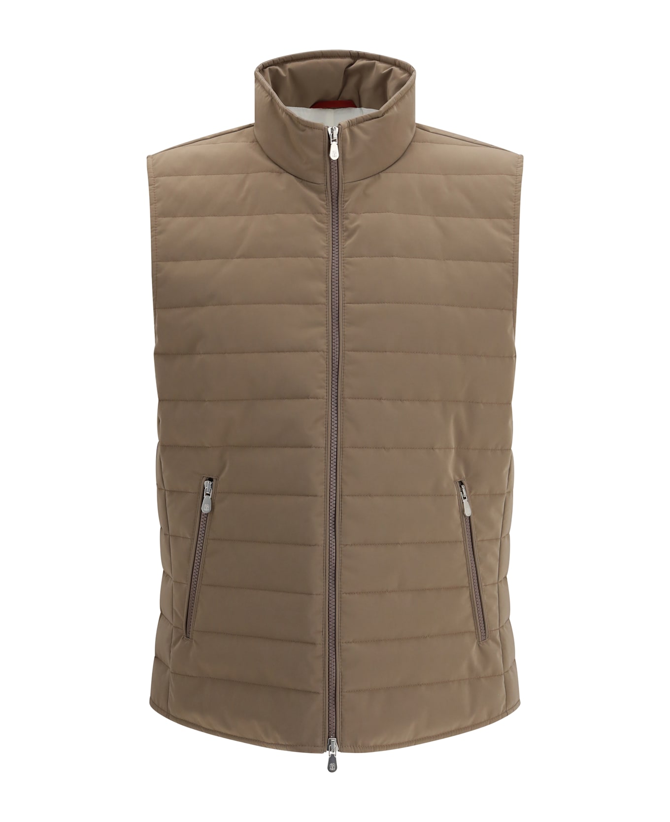 The quilted vest jacket by brunello cucinelli features refined padding that offers both lightness and warmth. the design includes a front closure with a two-way zipper, two welt pockets on the front, and a slightly raised collar that adds elegance and protection. a versatile and sophisticated piece, ideal for completing both casual and more polished looks.