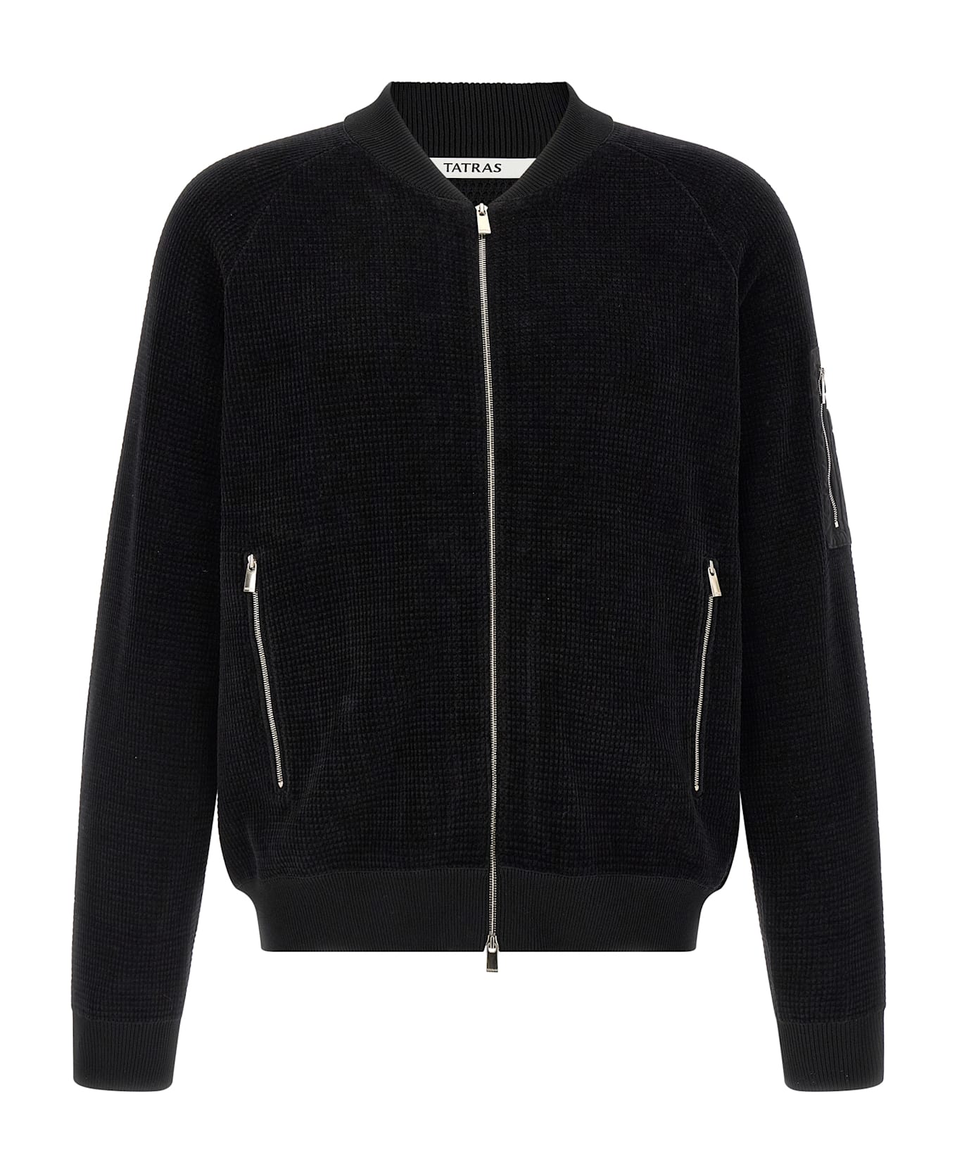 Waffle chenille 'Gavrio' bomber jacket with tonal stretch ribbed knit details, high neck, front zip closure, pockets, long raglan sleeves with cuffs, and headband.
