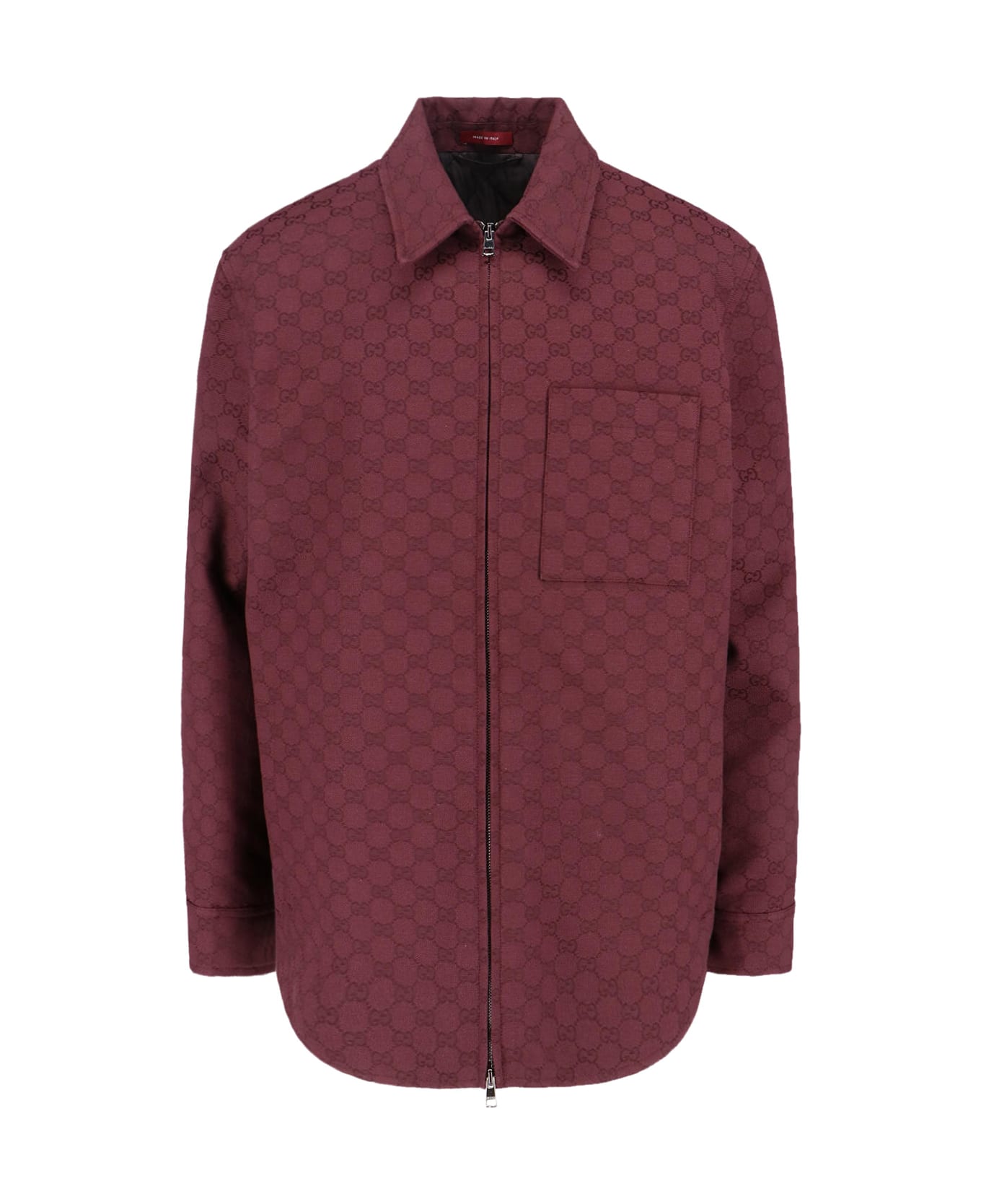 Gucci 'GG supreme' red cotton jacket in burgundy shade with all-over GG supreme logo pattern, classic collar, zip closure, long sleeves, front pocket, inner zip pocket, curved hem. Composition: 100% Cotton