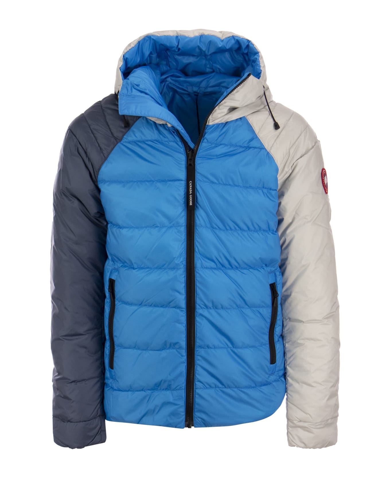 Made from lightweight recycled Ripstop fabric, this model is designed for total versatility and is reversible to offer two looks in one. The ultra-lightweight construction with channel padding means that this jacket won't weigh you down in the city or during hiking activities - it goes with you wherever you go. This versatile model offers two looks in one: a "colour block" side and a solid-coloured back. - Down-padded hood - Concealed elastic cuffs - One-way reversible zip - Two outer pockets: zipped handwarmer pockets - Two inside pockets: hand pockets with snap fasteners - The reversible side along the right arm has canada goose silver lettering DESIGNER ID: 2729MCB 1385 Composition: Outershell and Reverse shell: 100% Polyamide Filling: 90% Duck down, 10% Duck feathers