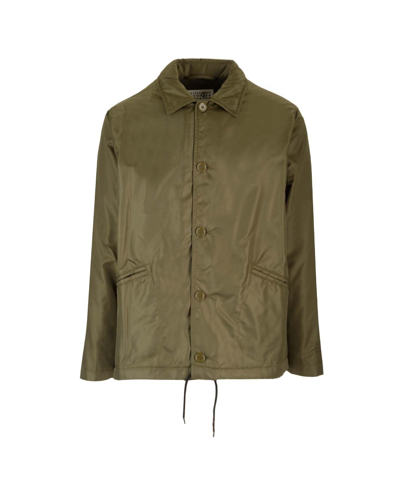 Lightly padded khaki green nylon jacket from MM6 Maison Margiela, with shirt collar, front buttons, adjustable hem with drawstring. Composition: Tessuto Primario: 100% Poliammide