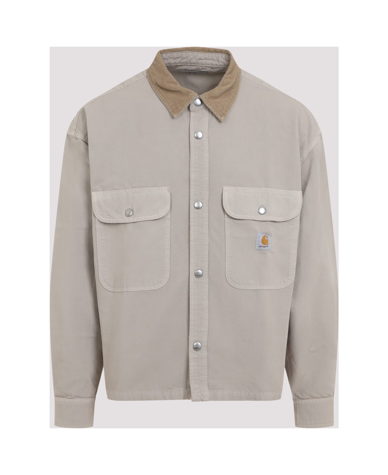 Carhartt Wip Prescott Beige Cotton Jacket. Crafted from beige cotton, featuring a brown corduroy pointed collar, a front snap button fastening, flap pockets on the chest, a logo patch detail, dropped shoulders, long sleeves with buttoned cuffs, a back yoke, and a rounded hem.