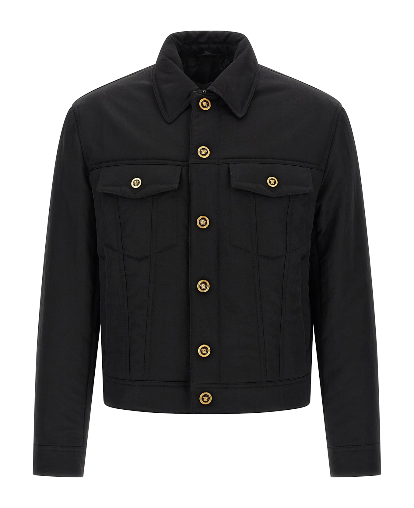 Lightly padded nylon jacket, shirt collar, front metal 'Medusa' button closure, pockets, long cuffed sleeves, cupro lining. Composition: 100% nylon