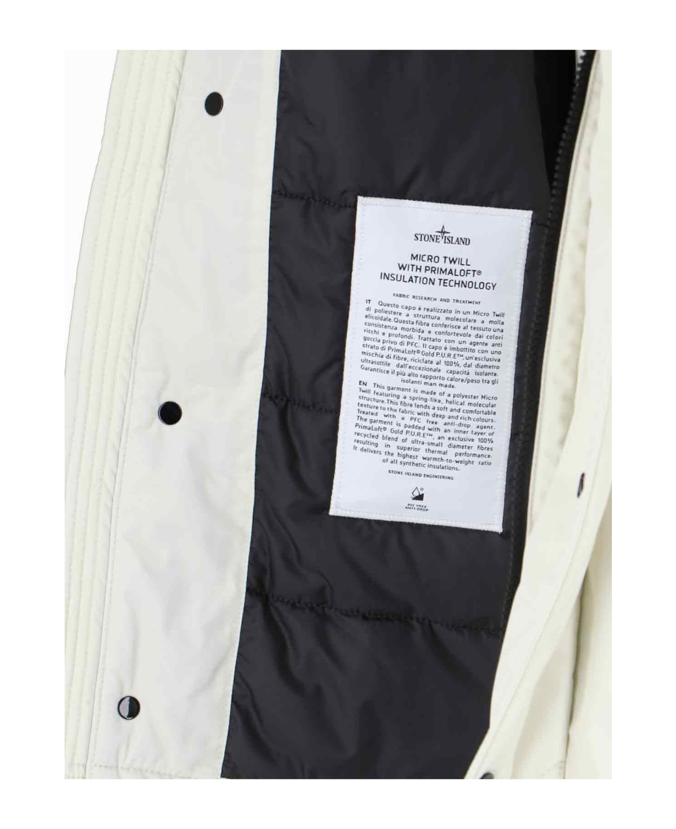 Stone Island technical hooded jacket in cream twill fabric, drawstring, button closure and double hidden zip, two side zip pockets, side Compass logo badge, straight hem, elastic waistband detail on the hem. composition: 100% polyester