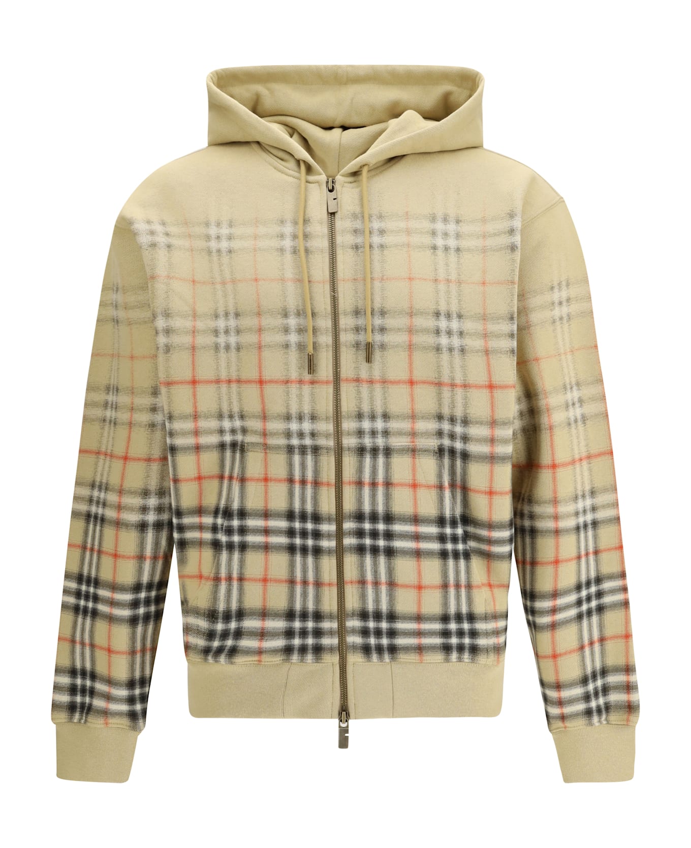 The gradient check cotton hoodie by burberry is crafted from lightweight terry cotton with the distinctive burberry check gradually fading into a solid color. the hoodie has a comfortable fit and antique-finish metal details. it features a two-way zip closure, drawstring hood, kangaroo pockets, and ribbed trim for a casual yet refined look. Composition: 100% % Cotton