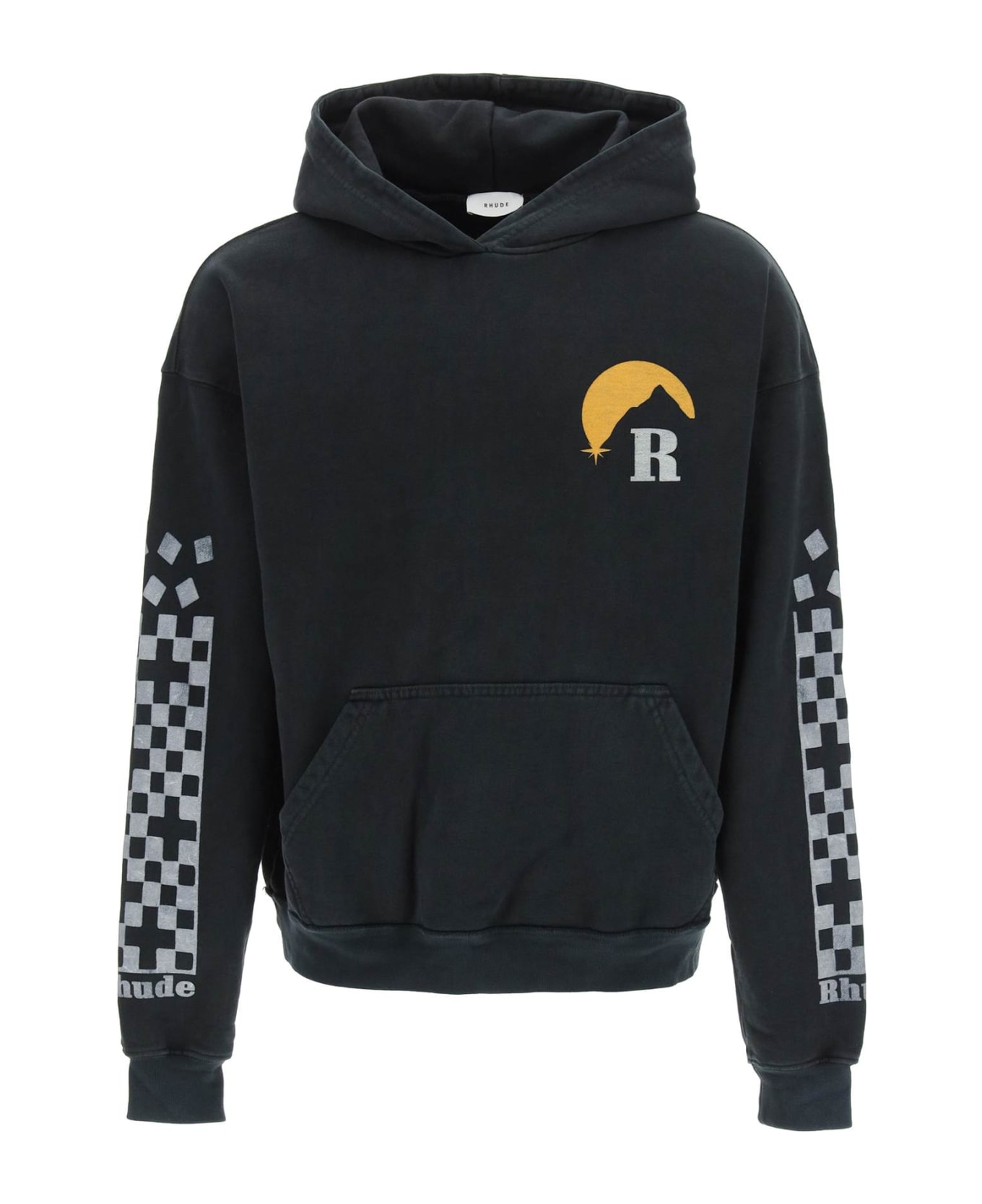 RHUDE hooded sweatshirt in washed cotton jersey with oversize cut, featuring mini logo printed on the chest and maxi graphic print with logo lettering on the back. Vintage-effect graphic prints on the sleeves. Boxy fit with dropped shoulders, kangaroo pocket, ribbed stretch edges. Double pleat detail on the upper back. Unbrushed interior. The model is 185 cm tall and wears a size M.