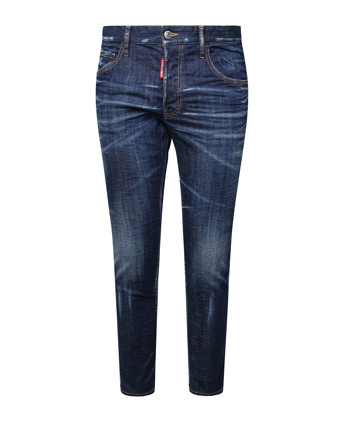-Jeans in stretch cotton denim -Straight fit -Used wash and destroyed details -Five pocket model -Fastener with covered buttons -Logo label on the flap -Loop on the back -Rear leather label -Made in Italy -Colour: Blue