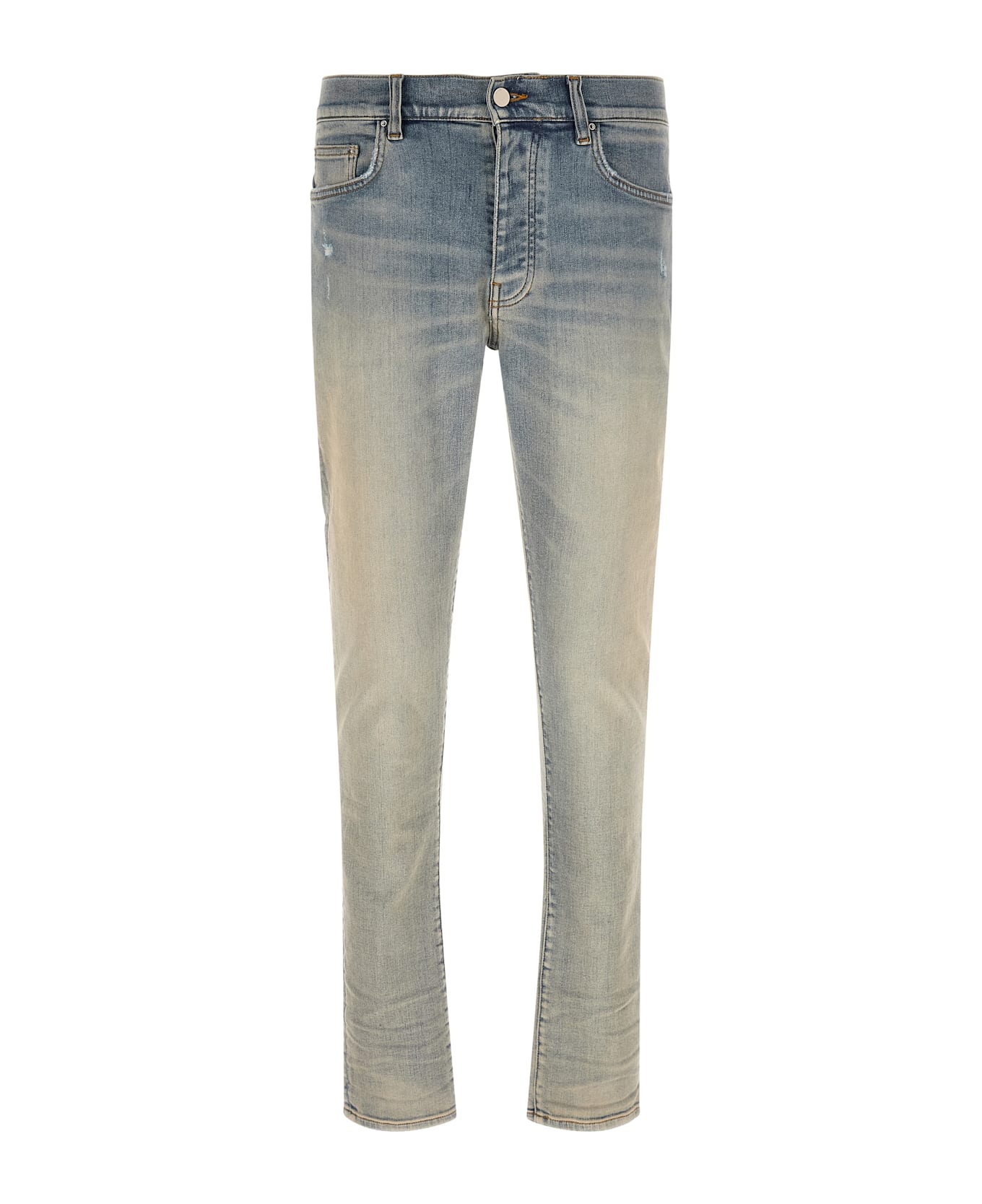 'Stack' used-effect stone washed stretch Italian cotton denim jeans, contrast stitching, front button closure, five pockets, back leather logo tag. This garment has undergone a special process that has resulted in intentional variations in shades and colors and adds unique characteristics to the garment.