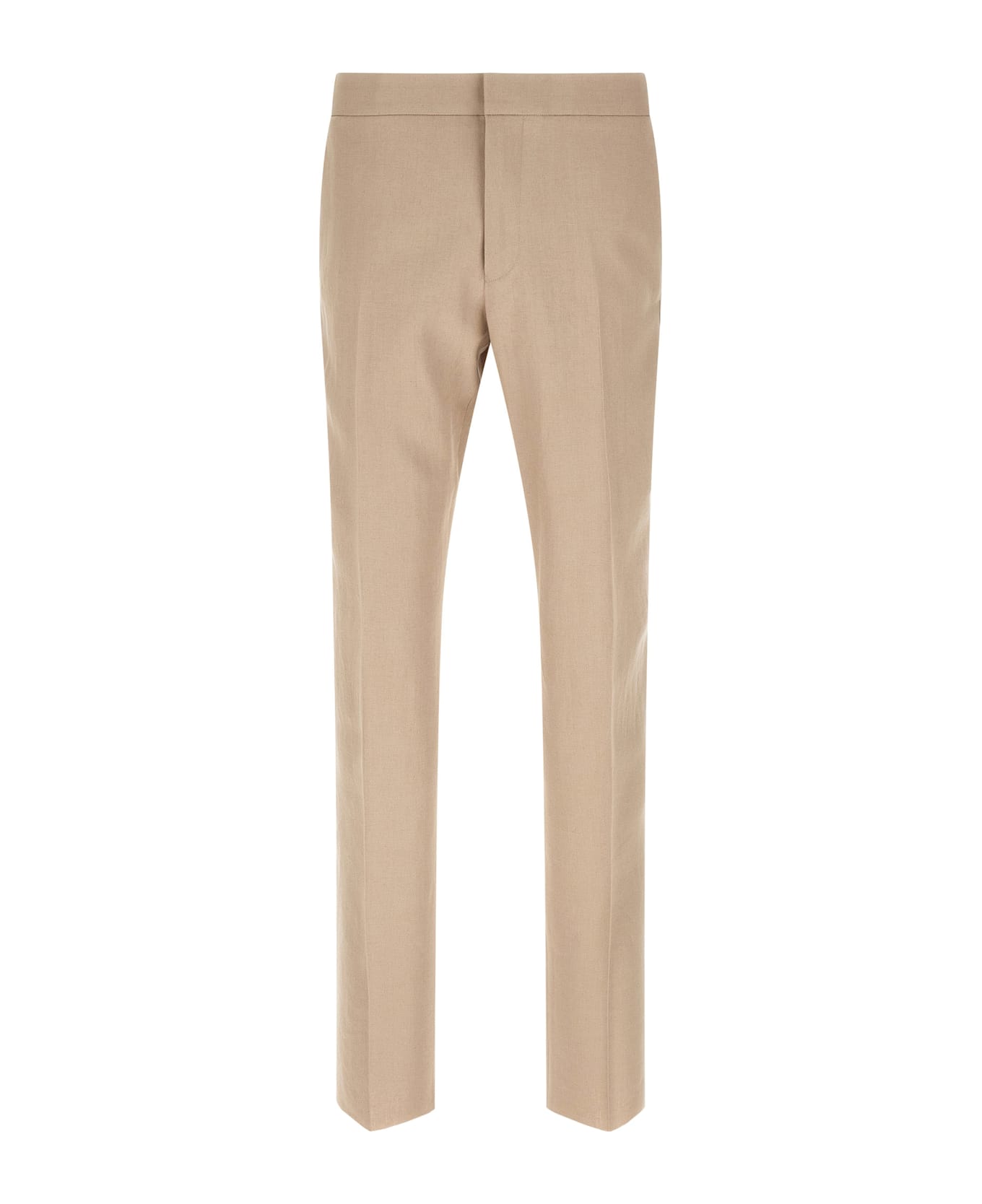 Linen trousers, formal design, zip and button closure, elastic waistband, adjustable drawstring, side pockets, straight leg with front stretched pleat, back welt pockets with button. Composition: 100% linen