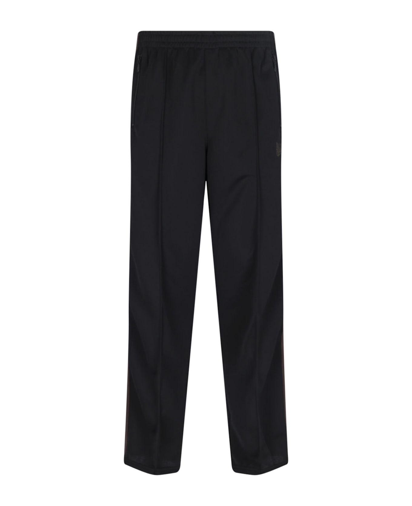Needles 'Poly' black fabric track pants with mid elastic waistband, two front pleats, two side zip pockets, brown animal print logo embroidery on the side, iconic brown bands on the side, one back zip pocket, straight leg.