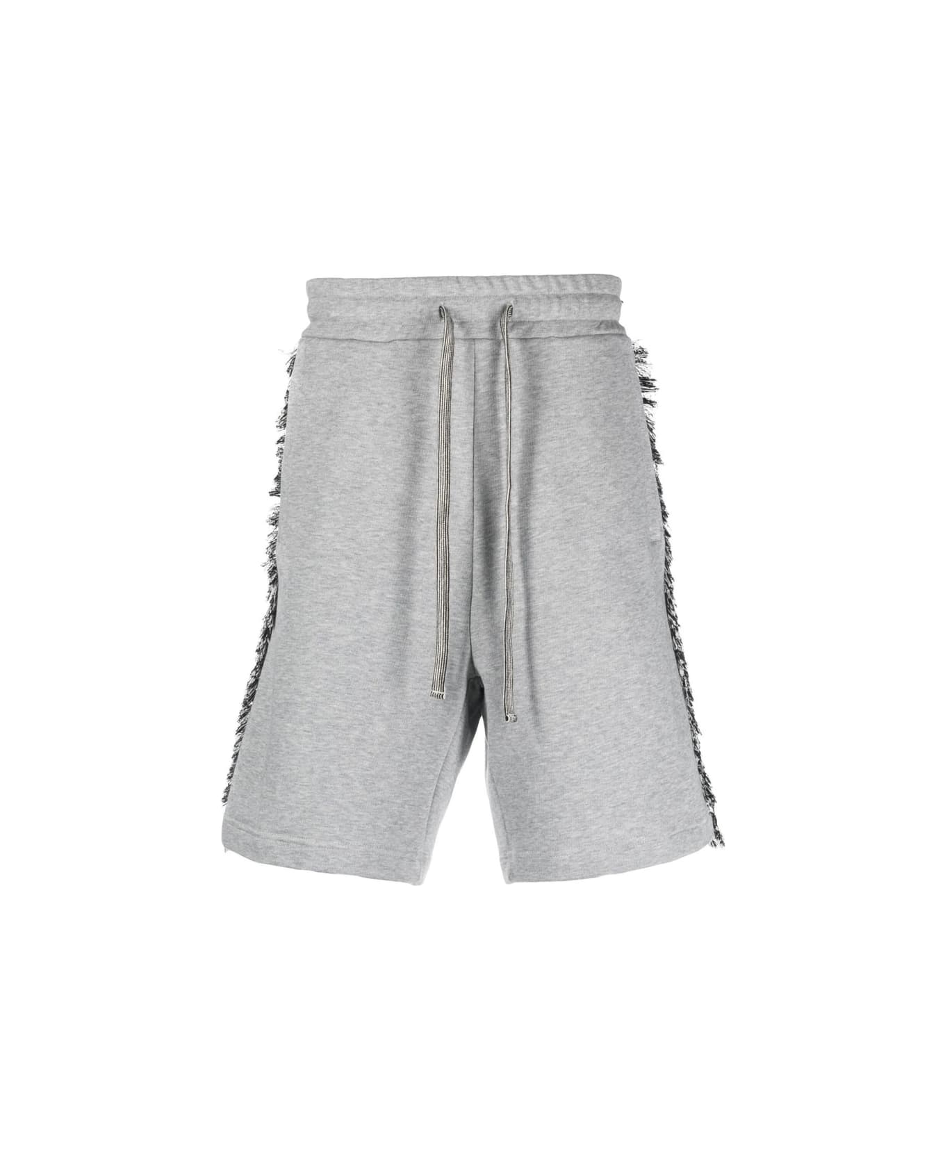 heather grey cotton contrasting panel detail embroidered design fringed edge elasticated drawstring waistband straight leg knee-length two side inset pockets