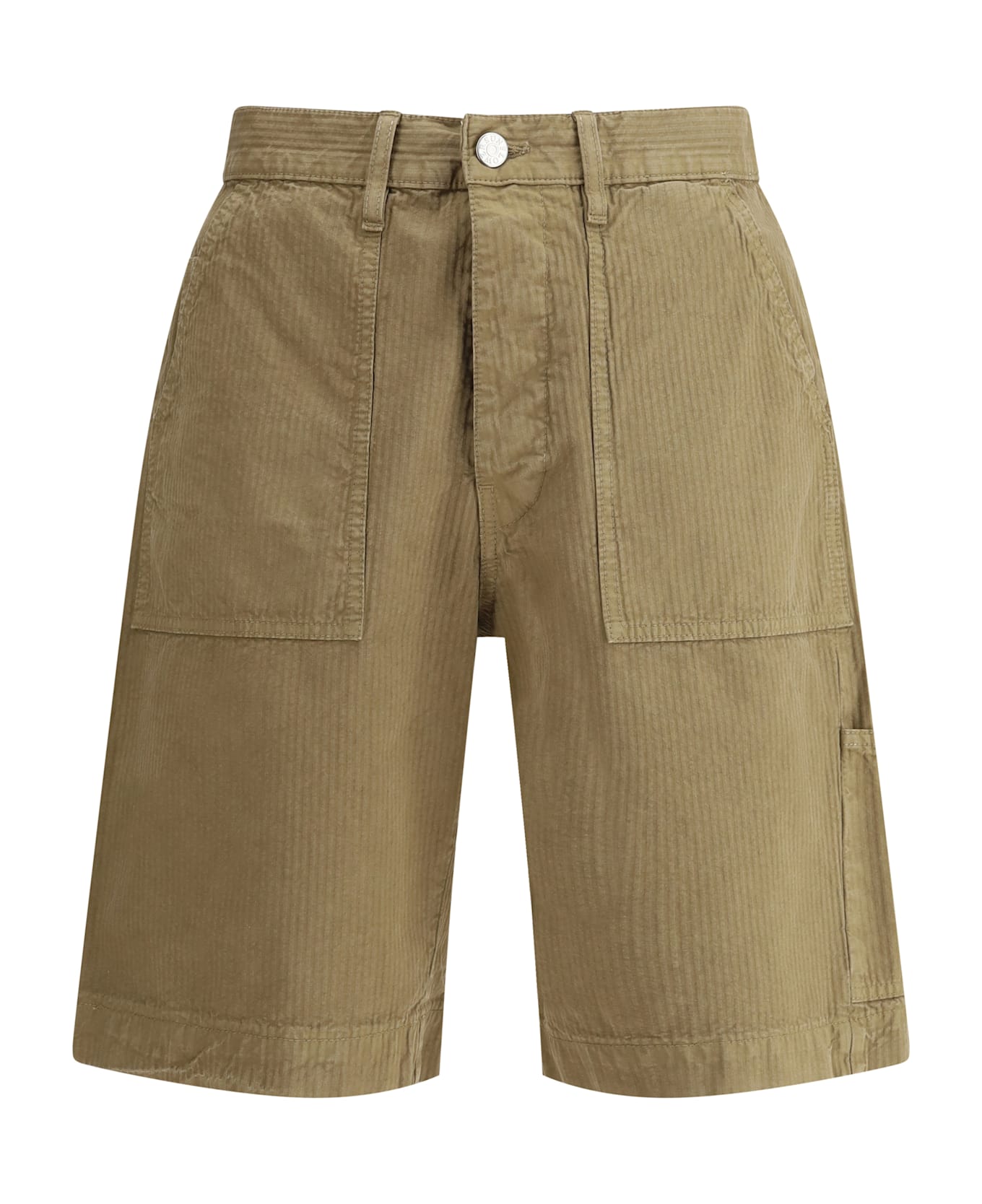 Sunflower's cotton work shorts combine practicality and style in a modern, functional design. the front button fastening gives a sleek, neat look. two patch welt pockets on the front offer extra storage for essentials, while patch slit pockets on the back add a touch of utility and style. belt loops at the waist allow you to add an accessory to personalize your look. a distinctive detail is the "worker pocket" on the side panel, which recalls a more casual, utilitarian aesthetic. the vertical stripe pattern gives a dynamic, contemporary effect, perfect for a sophisticated yet practical summer look.