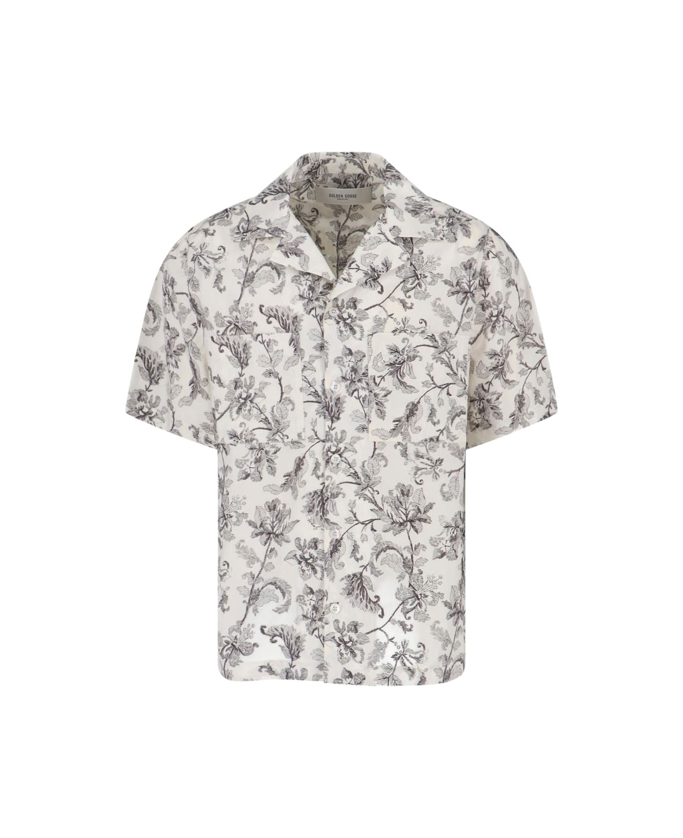 Golden Goose white cotton shirt with floral pattern, collar, front button closure, short sleeves, straight hem.