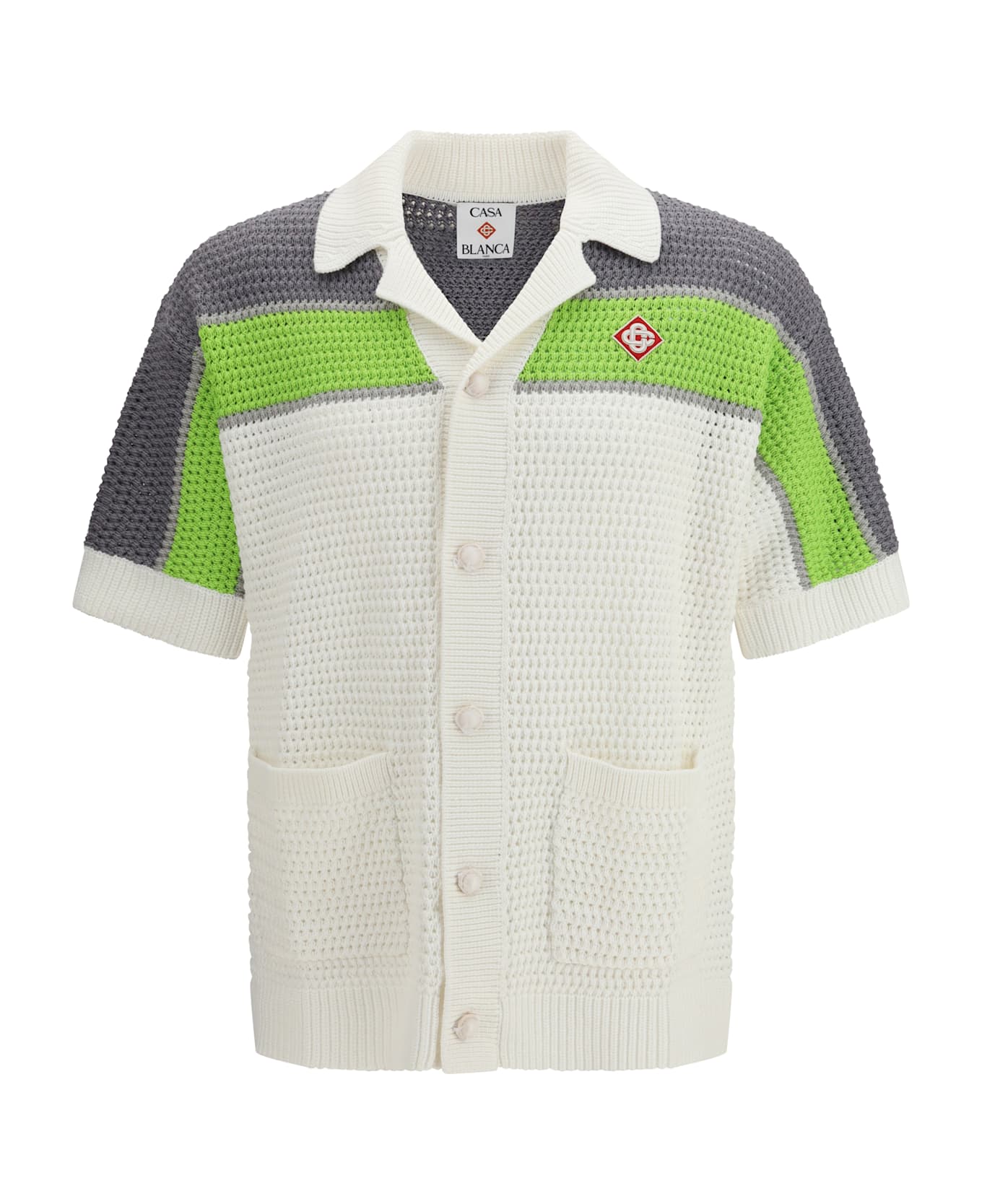 The crochet shirt by casablanca is a refined and original garment, made from pure cotton crochet for a light and breathable summer look. the lapel collar and button closure add elegance to the design, while the two patch pockets on the front offer practicality and style. the ribbed edging adds a touch of detail, while the logo appliqué on the chest confirms the authenticity and exclusivity of the brand. a versatile and sophisticated piece, perfect for a casual-chic look.