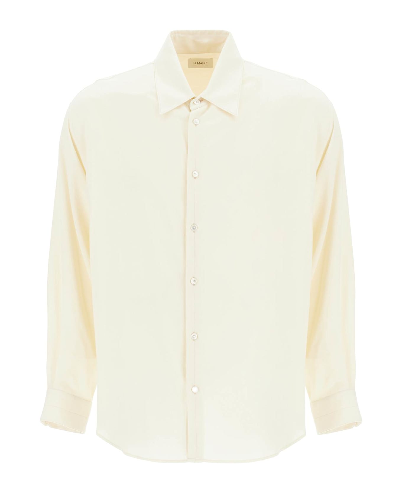 LEMAIRE's relaxed fit shirt with dropped shoulders, made from a lightweight blend of wool and viscose. It features a classic pointed collar, French button placket, and double-buttoned angled cuffs. The style is completed by a back yoke with a box pleat and a curved hemline. The model is 185 cm tall and wears a size M.