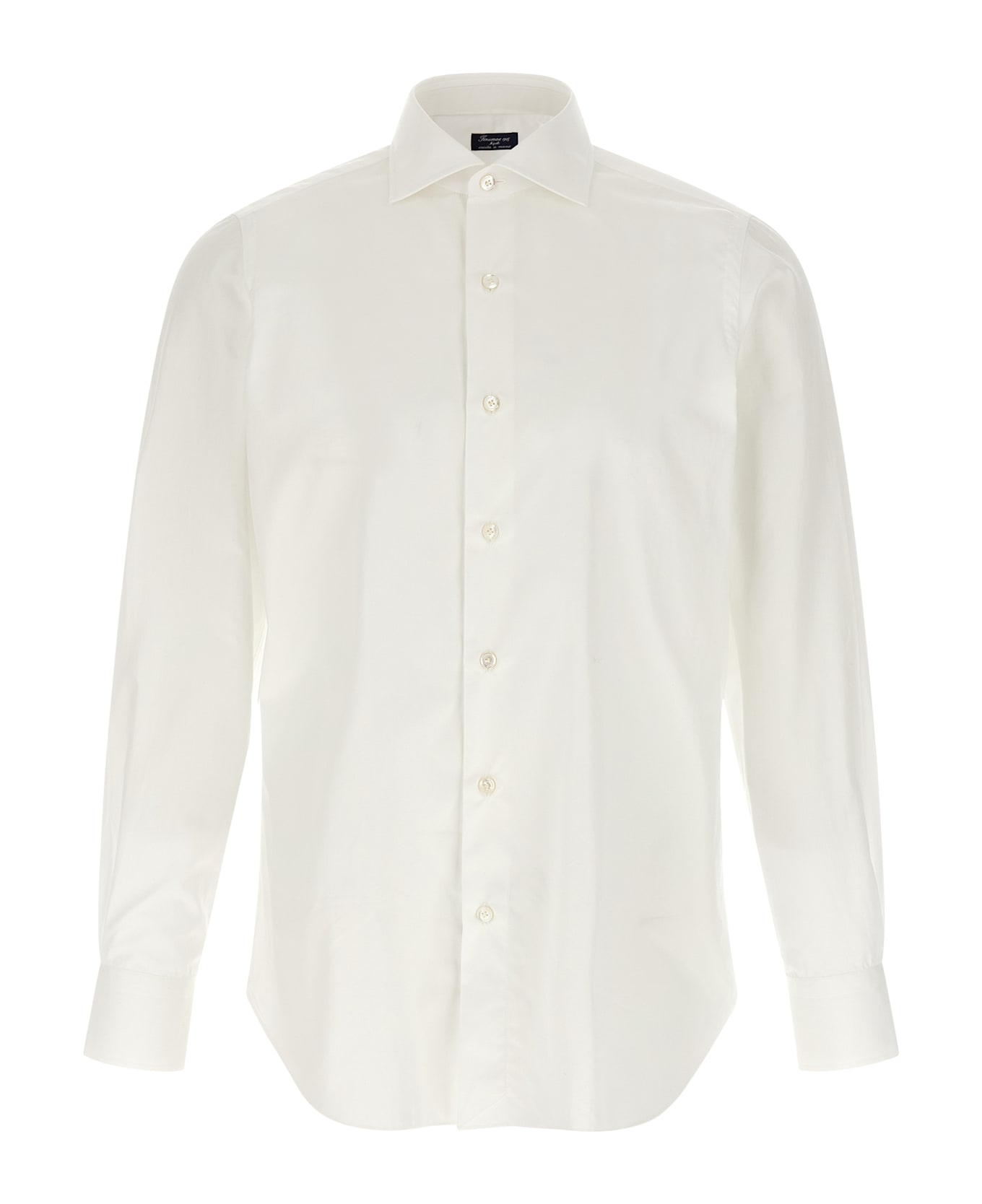 'Napoli' shirt in 120 double twist cotton hand-sewn according to the Neapolitan sartorial tradition performing seven steps of embroidery, French 'Eduardo' collar with removable cue, front mother-of-pearl button closure with the classic lily stitching and embroidered buttonholes, long sleeves with round and typical cuffs " arriccio" that guarantees comfort and freedom of movement, rounded hem with tone-on-tone satin logo detail on the side slits.