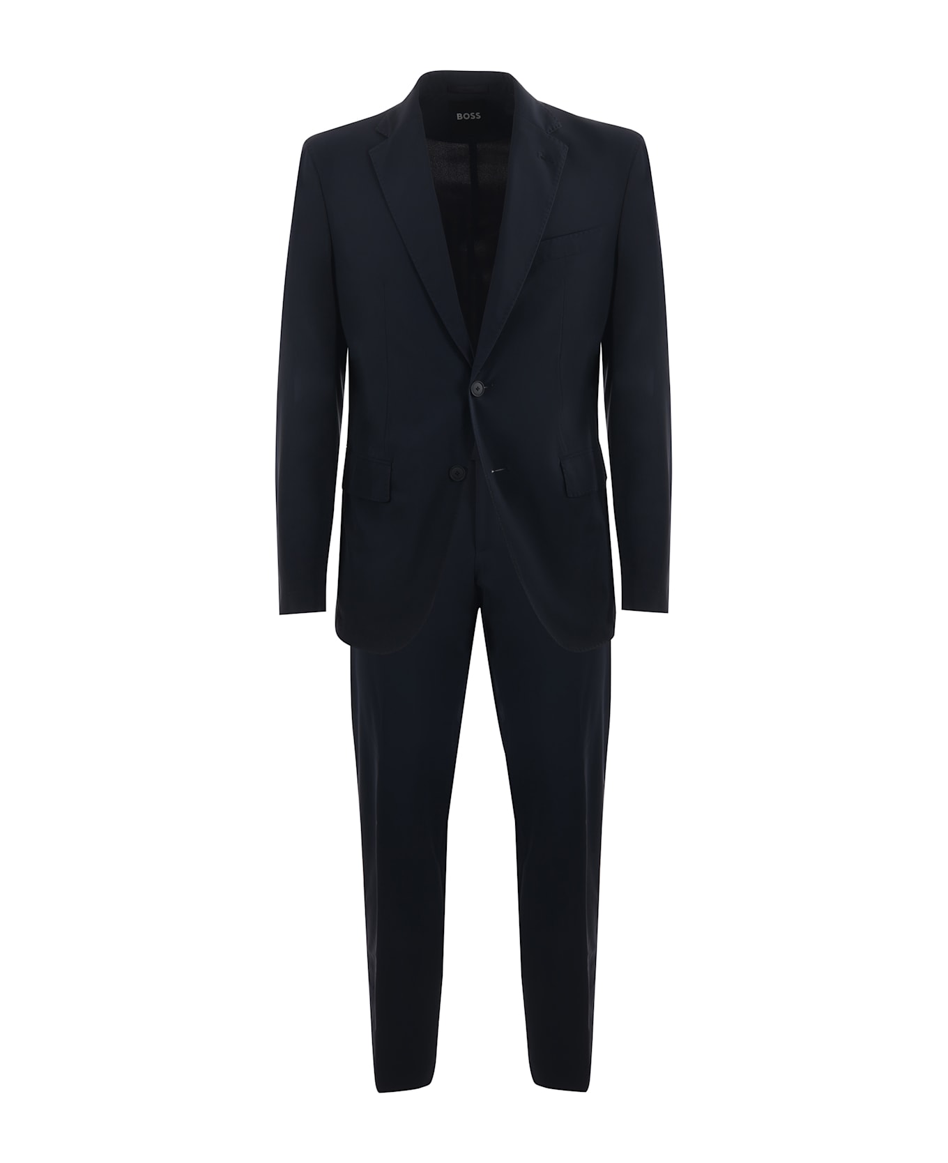 Boss suit in dark blue cool wool with tone-on-tone micro-pattern. Single-breasted jacket. Pointed lapels. Flap pockets. Welt pocket on the chest. Two button closure. Wrists with closed buttons. Central vent on the back. Lined. Matching trousers in dark blue cool wool with tone-on-tone micomotif. Diagonal pockets. Zip and hook closure. Welt pockets with buttons on the back. Slim fit Measurement in photo 48 85% virgin wool 10% polyamide 5% elastene
