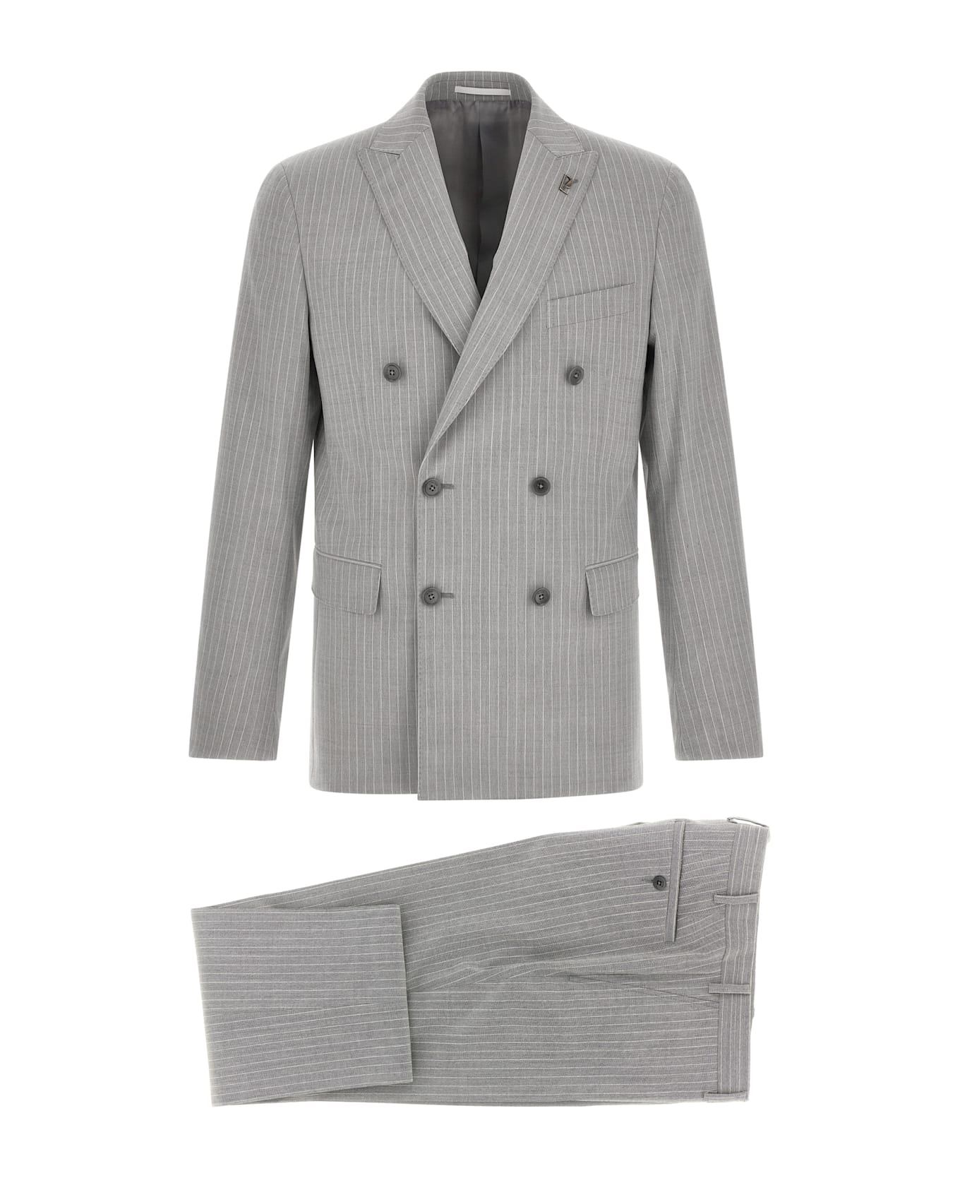 'Lord' pinstripe patterned wool blend dress consisting of double-breasted blazer with front button closure, peak lapels with removable metal brooch, breast pocket, flap pockets, cupro lining, two inner pockets, cuffs with opening buttonholes, back slits and trousers with stretched pleat, front 'americane pockets', back welt pockets, front zip and button closure, viscose lining.