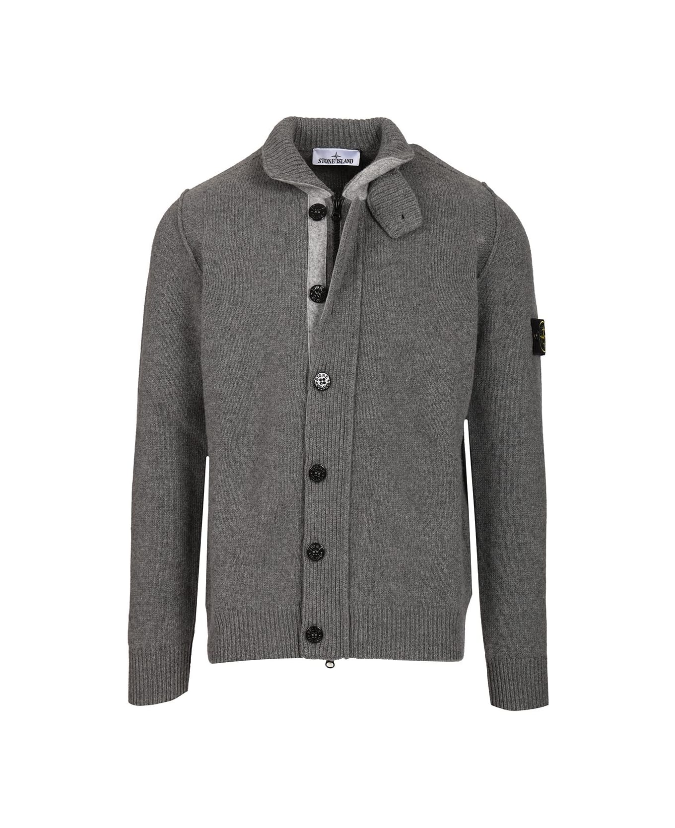 Ribbed felt-lined stand collar with knit strap that can be buttoned across neck or back onto collar. Reverse stitch band at shoulders and along armholes. Stone Island badge on left sleeve. Ribbed cuffs and bottom band. Two-way zip under felt-lined button placket. Regular fit. Composition: 20% POLIAMMIDICA + 80% WOOL