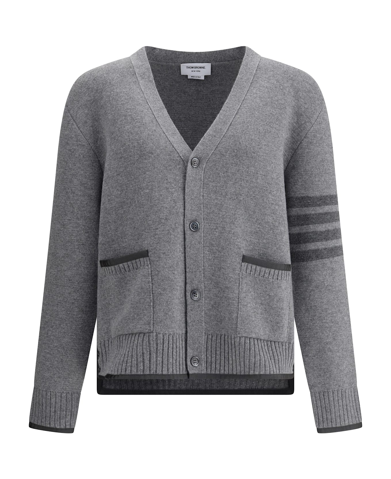Thom browne's merino wool cardigan is a classic revisited with iconic details and sartorial care. it features a v-neck, front button closure and two patch pockets with contrasting piping. the hem and cuffs are ribbed, while contrasting bands on the left sleeve and discreet side slits add a distinctive touch to the essential design.