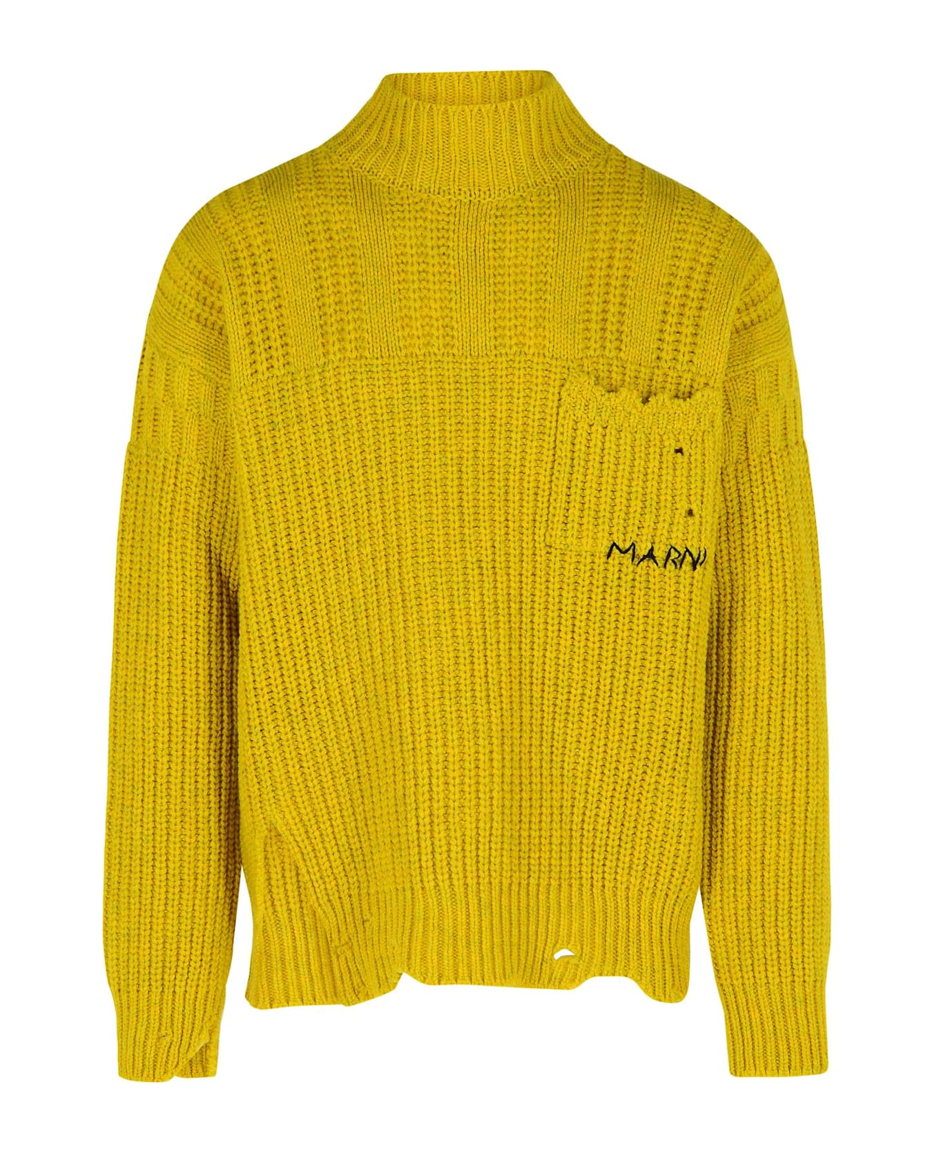 Coarse knitted in virgin wool, ribbed raised neck, ribbed decorative pattern, chest pocket with contrasting decorative 'Marni' lettering, side split hem and torn effect Composition: 100% virgin wool
