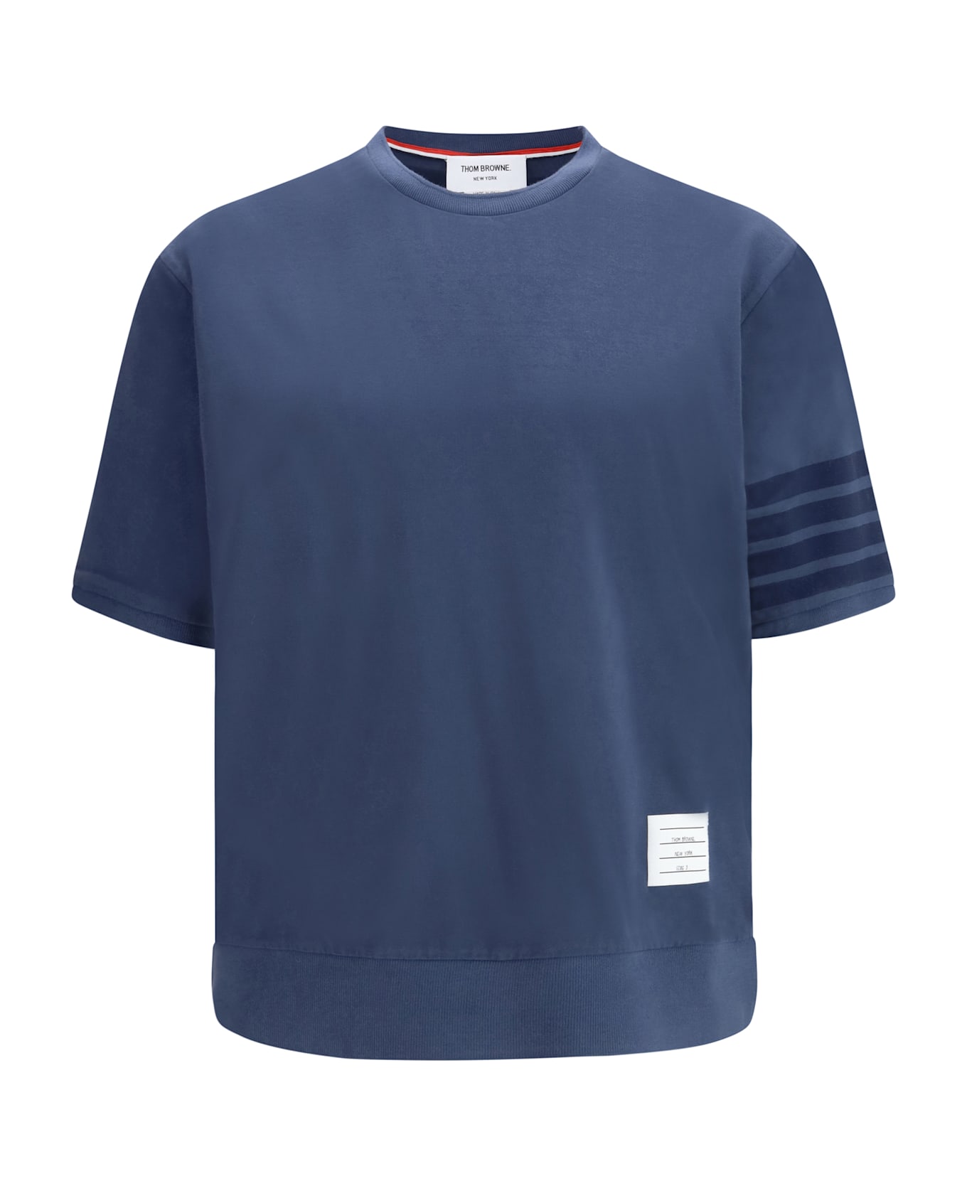 The 4-bar cotton jersey t-shirt by thom browne reflects the brand s disciplined aesthetic through graphic details and refined proportions. the crew neck creates a clean line, while the elasticated hem adds structure to the silhouette. the 4-bar motif and the patch applied on the lower left side with the brand name and signature information complete the piece with an iconic and recognizable touch. Composition: 100% % Cotton