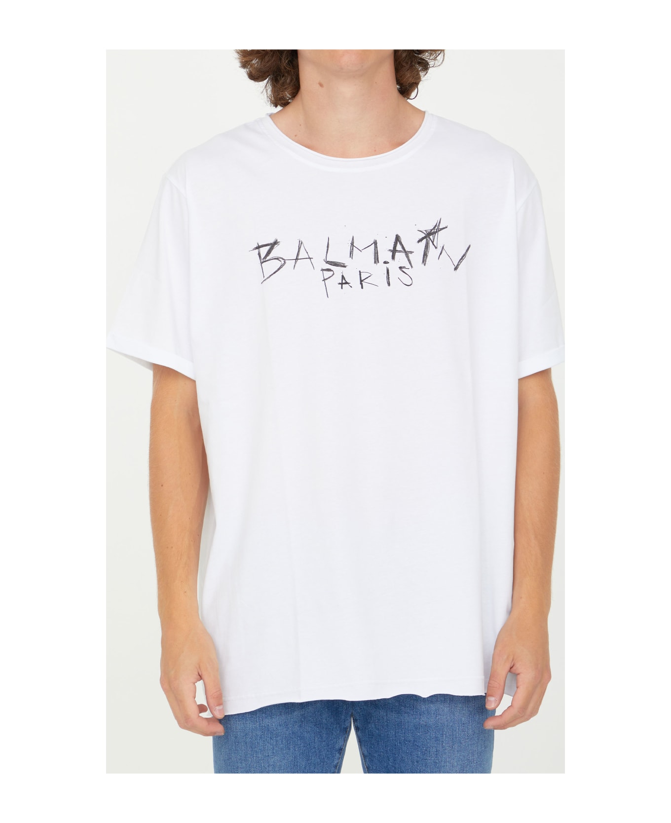 Short-sleeved crewneck t-shirt in white cotton with Balmain Paris graffiti-effect logo printed on the front. Balmain tag on the back of the neck.