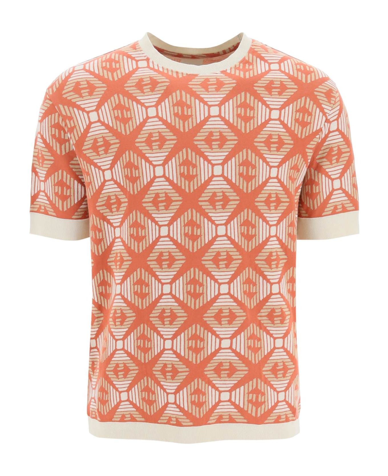 Emporio Armani crewneck t-shirt in lightweight organic cotton jacquard knit, decorated with the signature eagle logo all over in a geometric pattern. Contrast ribbed trims, regular fit. The model is 187 cm tall and wears a size L. Composition: 100%CO