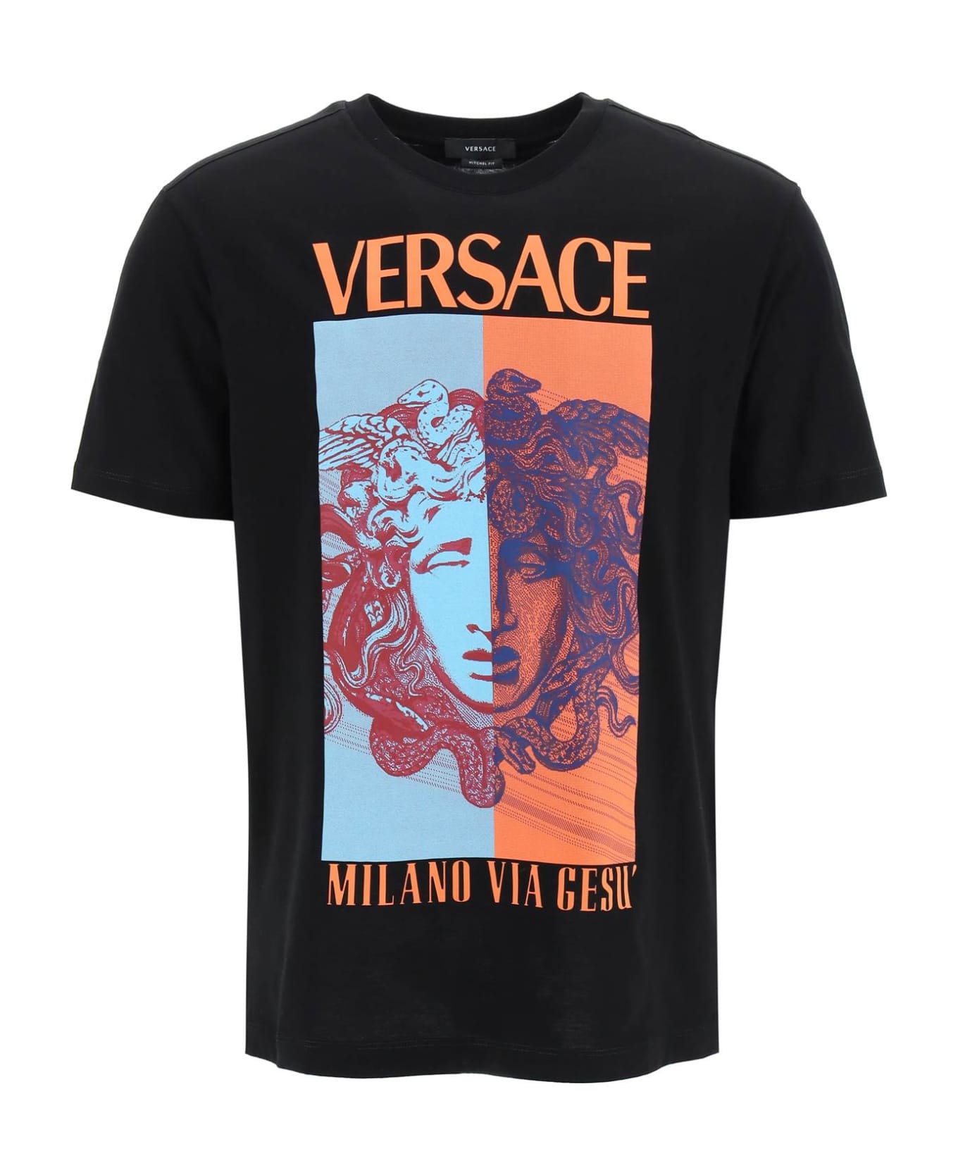 Versace crew-neck t-shirt in pure cotton jersey decorated with a branded graphic print at front. Micro-ribbed crew neck, regular fit. The model is 187 cm tall and wears a size L. Composition: 100% CO