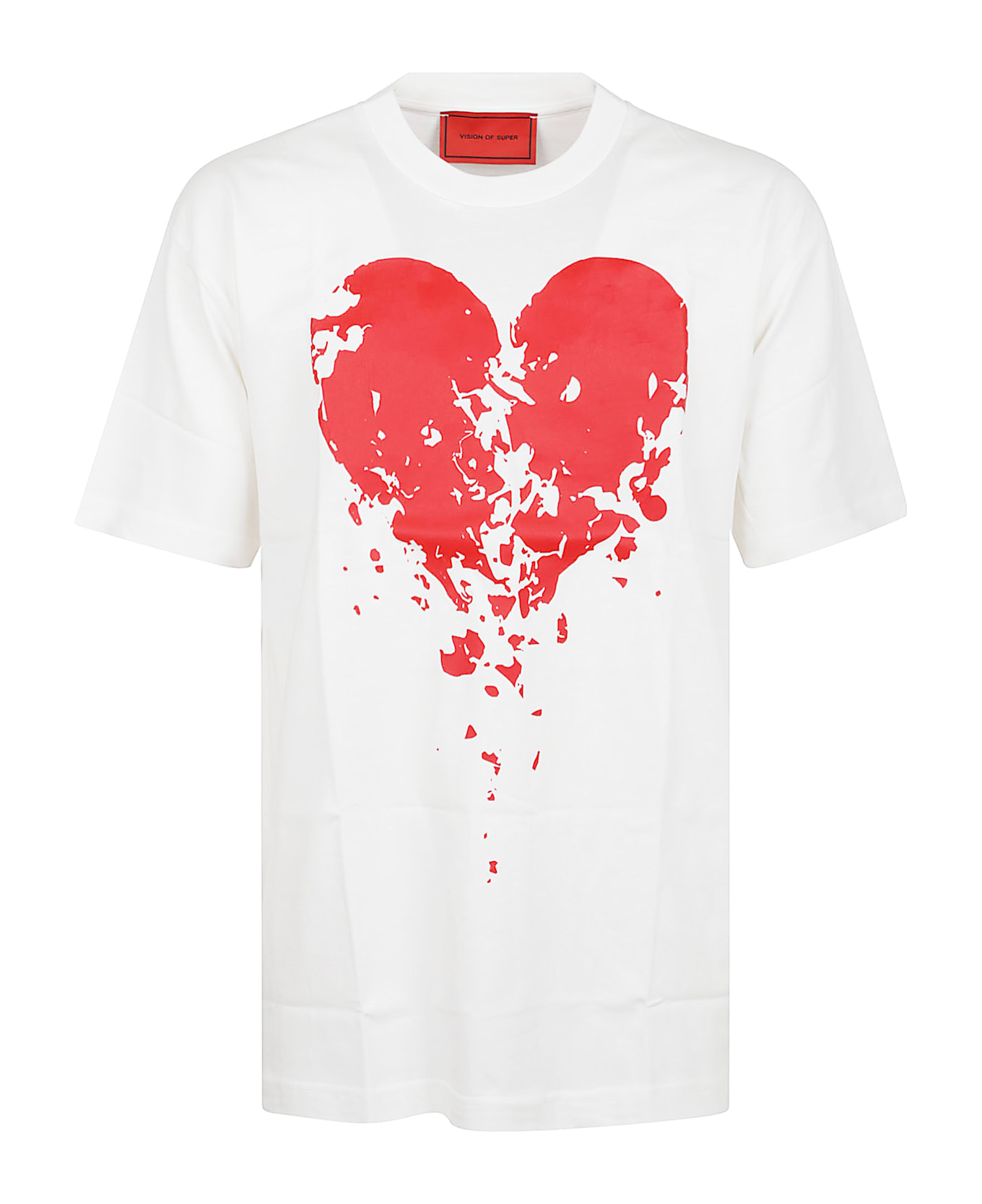 Off White T-shirt With Broken Heart Crack Print On Front, Vision Creative Print On Back And Red Label