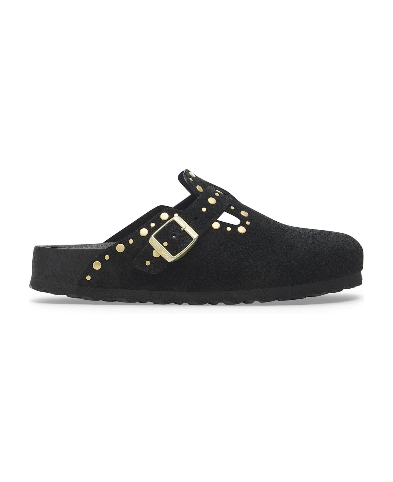 BIRKENSTOCK SABOT, an iconic model designed for those seeking comfort, quality, and uncompromising style. Made from black suede leather with gold studded accents, this unisex sabot perfectly conforms to the shape of the foot, providing a comfortable and durable fit. The anatomical cork and latex footbed, covered in soft suede leather, ensures optimal arch support and correct posture, even after many hours of use. The lightweight and cushioning EVA sole, along with the adjustable metal buckle, allows for a customized fit.