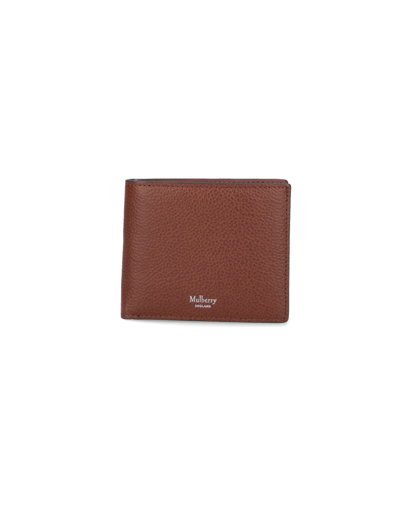 Mulberry 'Heritage' bi-fold wallet in brown hammered calf leather with silver logo print on the front, top bill compartment, four card slots, coin compartment, button closure detail, inner silver print.