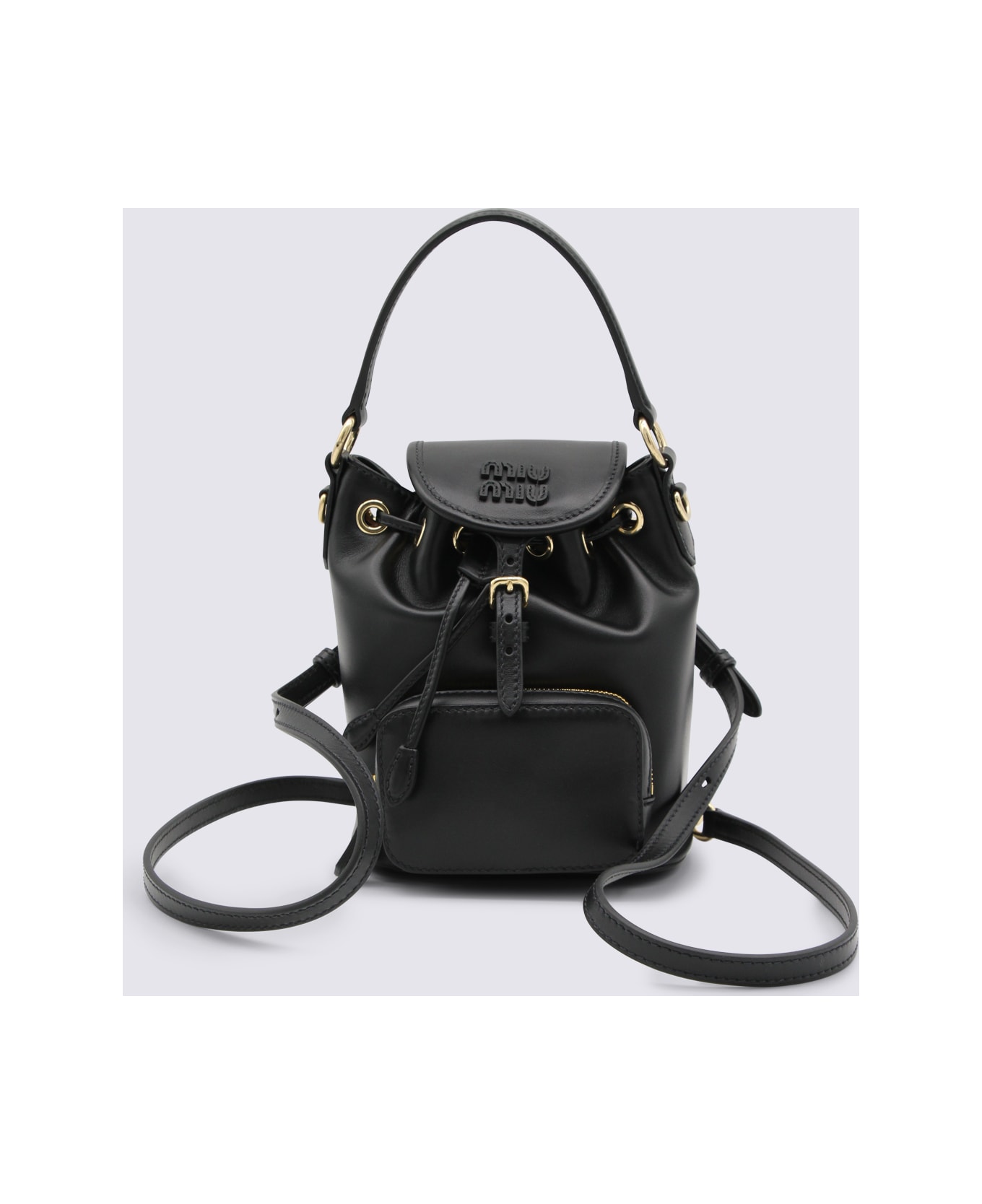 Black leather backpack from Miu Miu featuring top handle, main compartment, frontal pocket, engraved logo and adjustable straps.