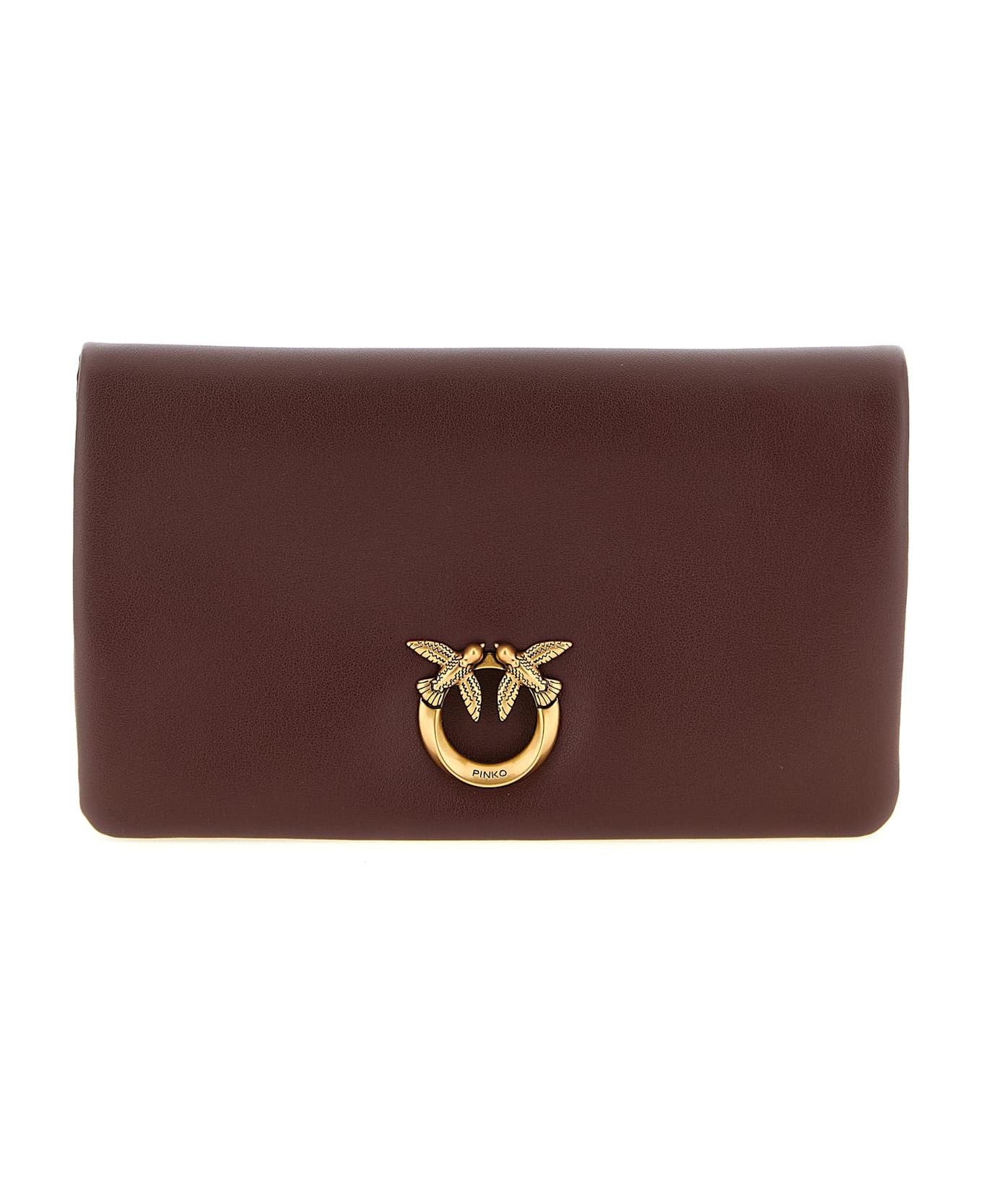'Love Click Soft Horizontal' mini padded leather clutch bag with flat design with rectangular shape, magnetic flap closure with front metal 'Love Birds Diamond Cut' logo, back pocket, cotton drill lining, removable chain shoulder strap, adjustable and removable leather shoulder strap decorated with metal that form the lettering logo PINKO.