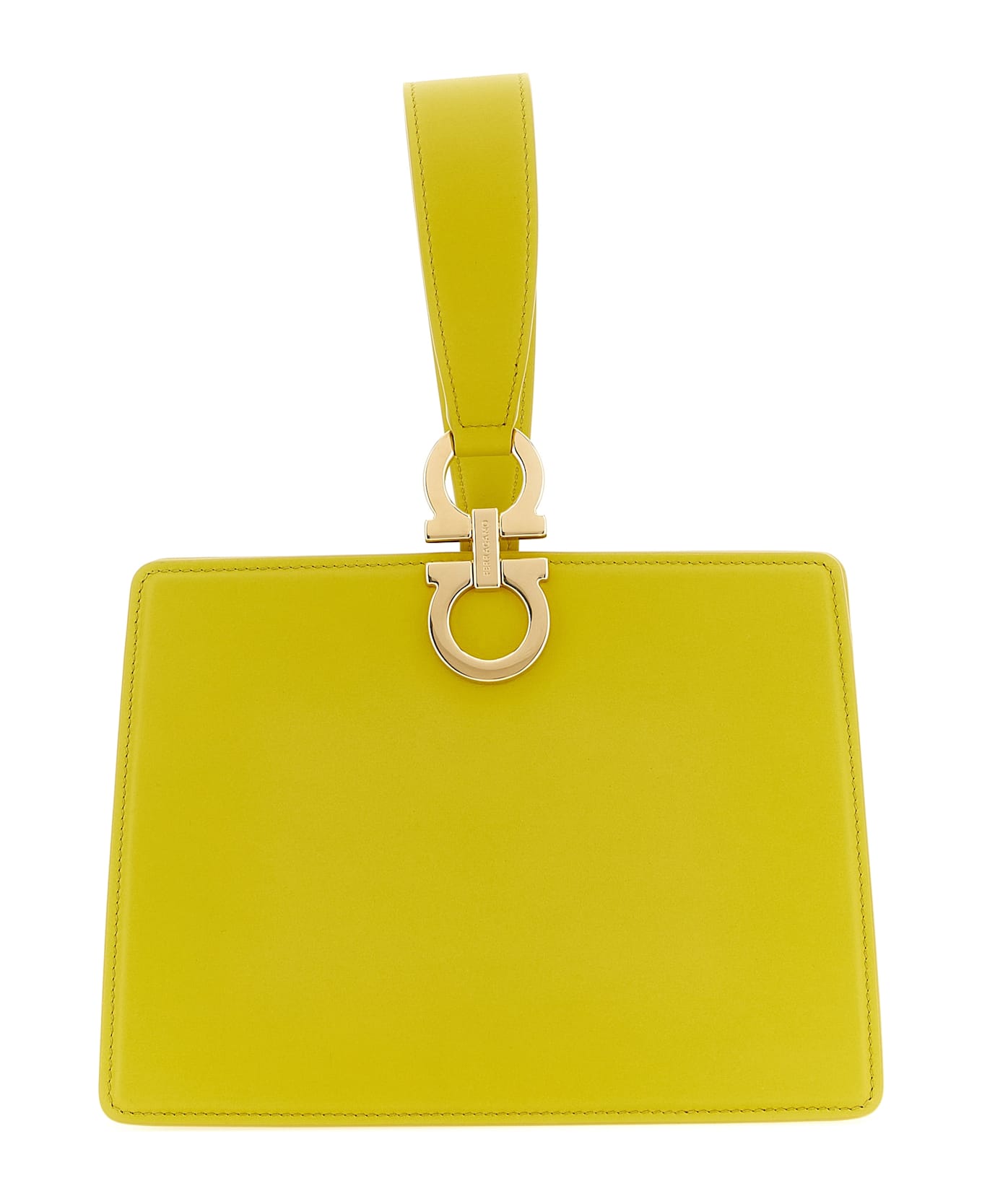 Leather mini clutch with a semi-glossy finish, bracelet with metal 'Gancini' detail that allows you to wear it on your wrist hiding the snap closure, lining.