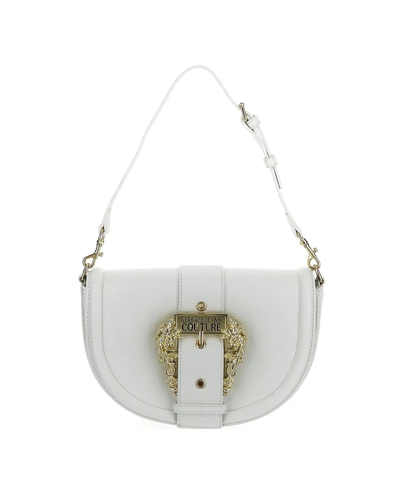 Versace Jeans Couture shoulder bag in white grained polyester with detachable and adjustable shoulder strap, flap with golden-finish metal baroque branded maxi buckle, magnetic closure, a main compartment, zipped pocket and gold-toned metal hardware.