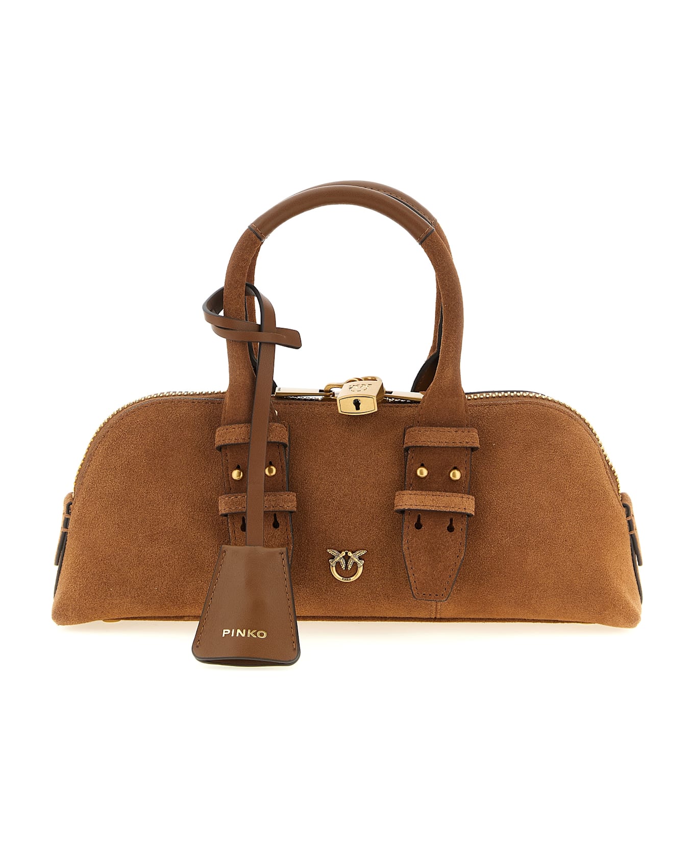 'Bowling Baguette' suede shoulder bag, metal 'Love Birds' logo on the front and embroidered on the back, double adjustable handle, top zip closure with padlock detail, rigid base with metal feet, adjustable and removable shoulder strap.