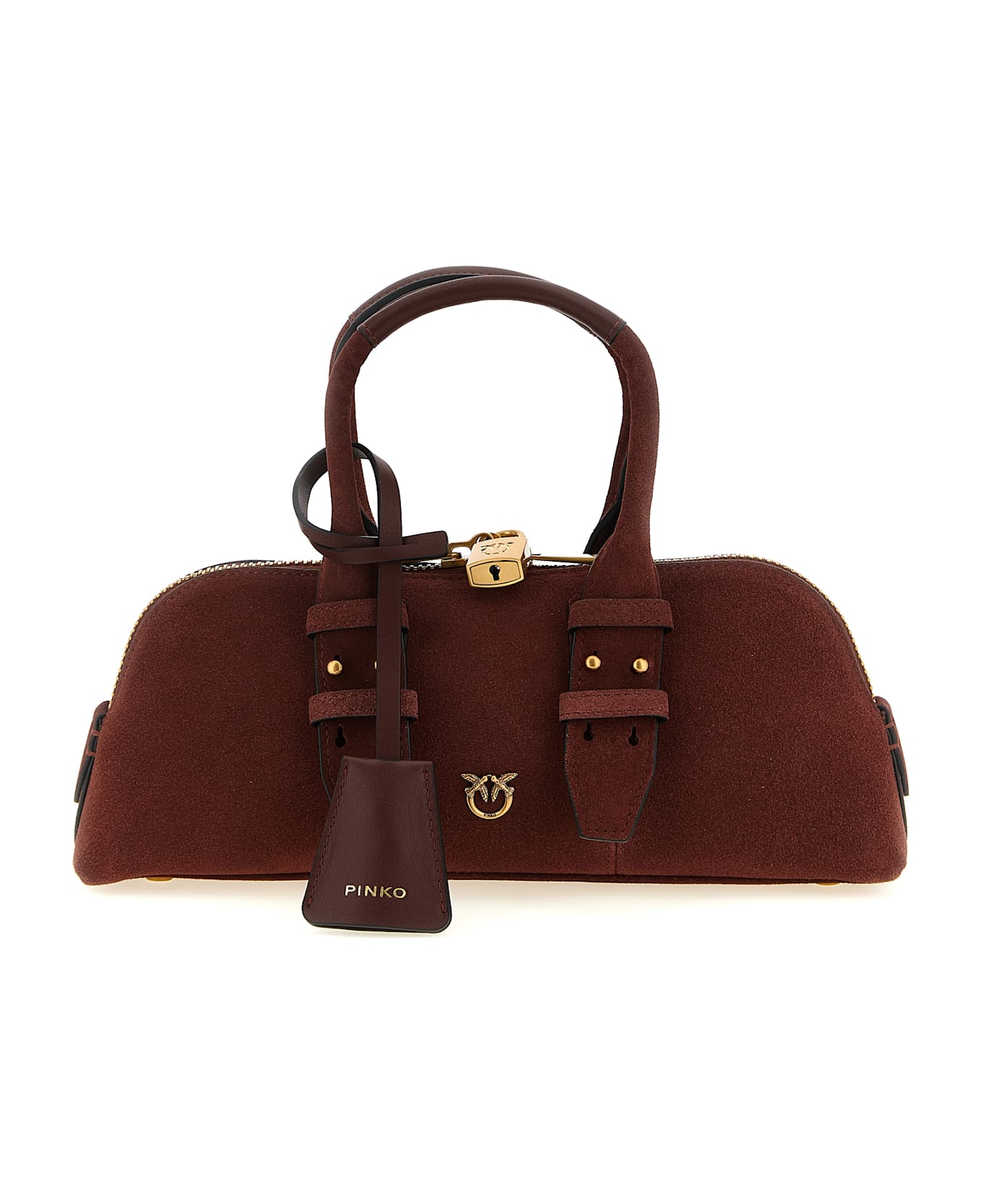 'Bowling Baguette' suede shoulder bag, metal 'Love Birds' logo on the front and embroidered on the back, double adjustable handle, top zip closure with padlock detail, rigid base with metal feet, adjustable and removable shoulder strap.