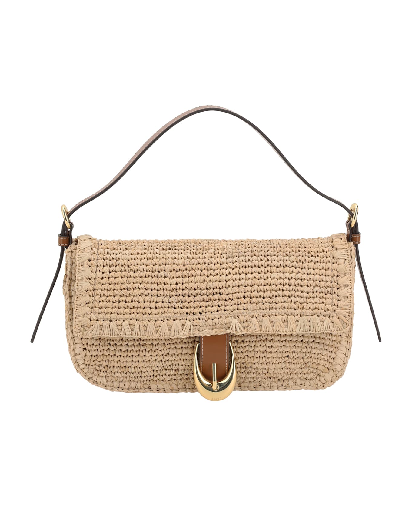 Staud's harlow shoulder bag is made of raffia, a natural material that gives a summery, refined feel. featuring an adjustable flat top strap, it offers comfort and versatility. the magnetic closure with front flap and applied buckle adds an elegant and functional detail. the interior, with a single compartment, is ideal for maintaining order and practicality. a cool and chic design, perfect for any casual or dressier occasion.
