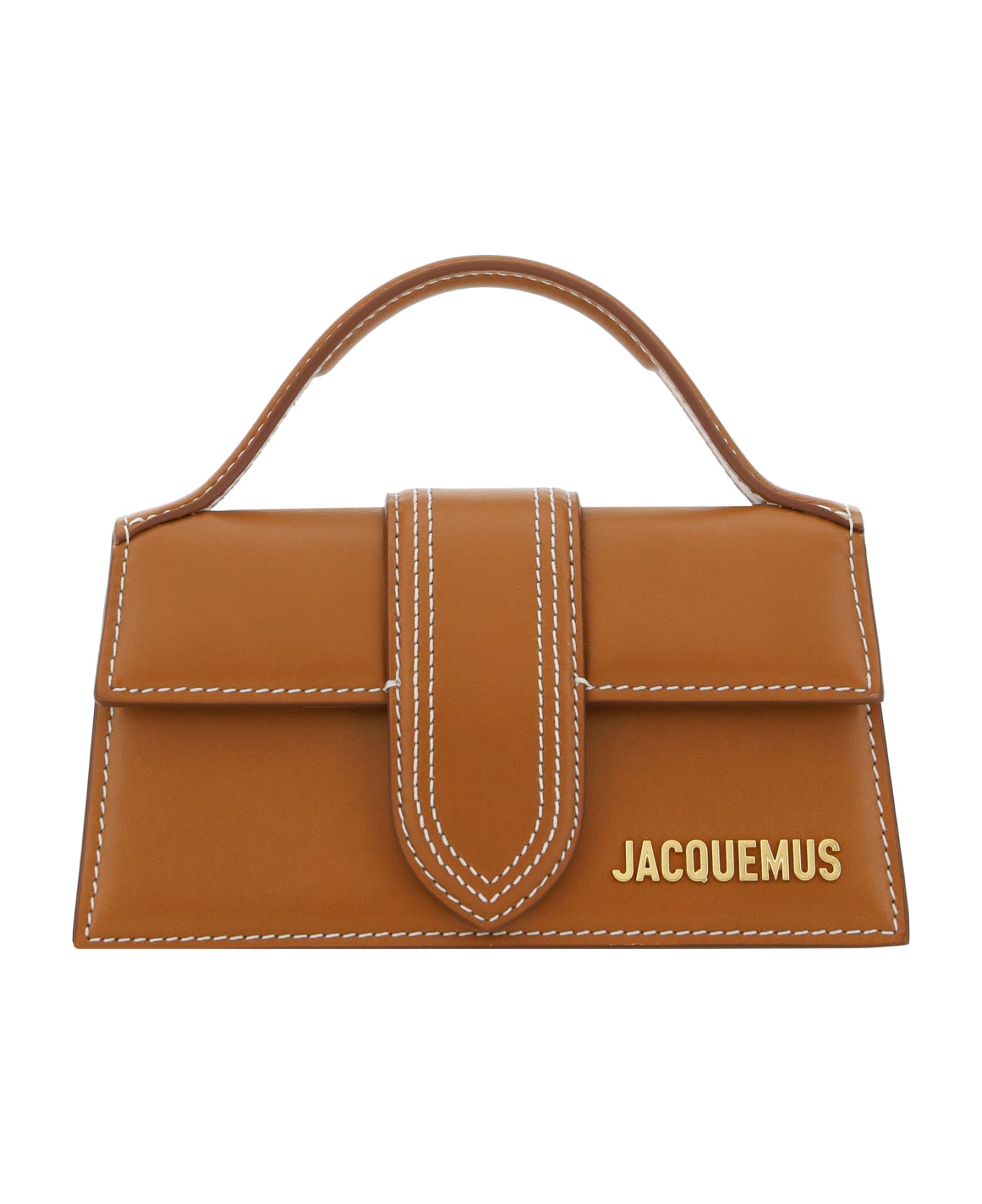 Calfskin le bambino handbag by jacquemus, featuring a flat top handle, an adjustable and removable shoulder strap, a three-dimensional plaque with iconic brand monogram applied in contrast on the front, a patch welt pocket on the back, a geometric design, and a flap with a magnetic button for closure on the front.