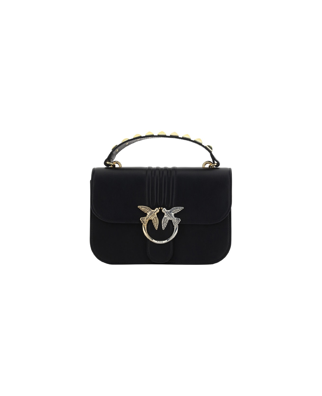 Calfskin love bell bag by pinko, front closure with magnetic button, rigid handle with metal studs on the top, removable chain shoulder strap, iconic love birds buckle embossed on the front, central internal compartment with zip for closure, two side compartments, one internal welt pocket, hammered leather design with embossed bands on the flap and back.