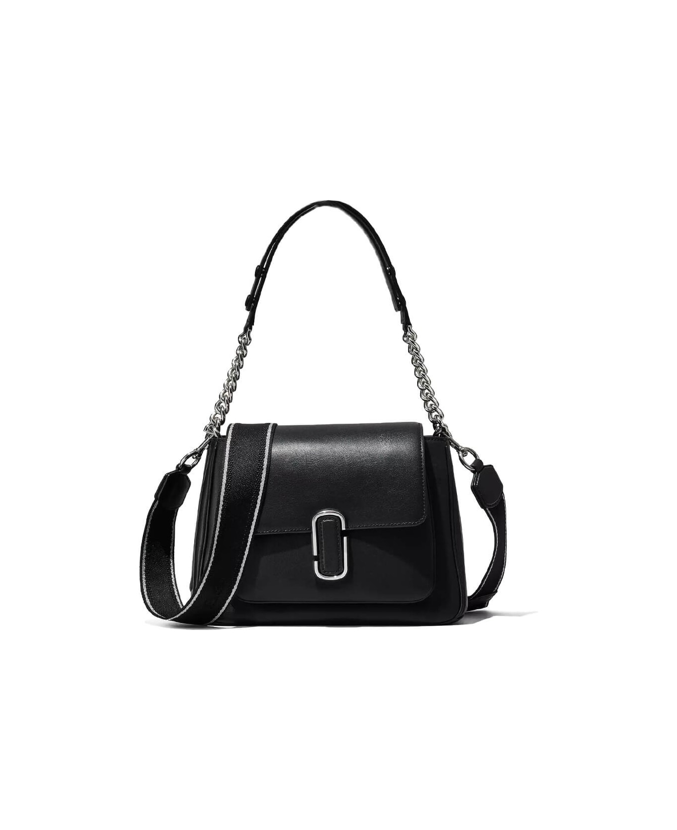 The Marc J Chain bag by Marc Jacobs made of black leather with silver-tone hardware and iconic logo on the front. Lined interior, featuring two compartments and a zipped slip pocket. Extendable leather handle with chain insert and matching fabric shoulder strap. Measures 29x22x13 cm.