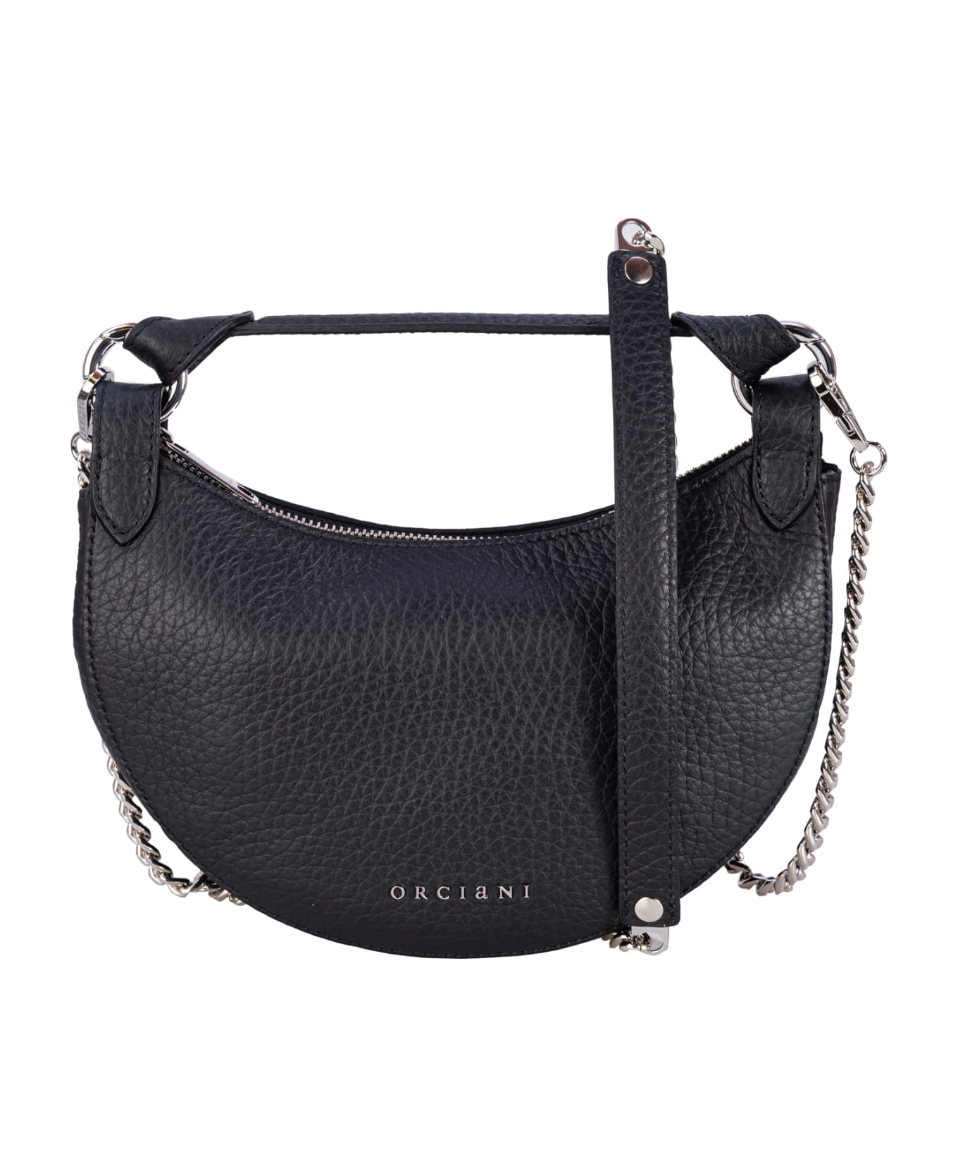 Orciani Mini Bag Dumpling Soft Nabucco in leather with shoulder strap. Pockets: internal card holder. Zip closure. Removable chain shoulder strap. Golden brass finish details. Dimensions: Width: 24cm, Height: 16cm, Depth: 10cm. Composition: 100% Leather. Made in Italy.