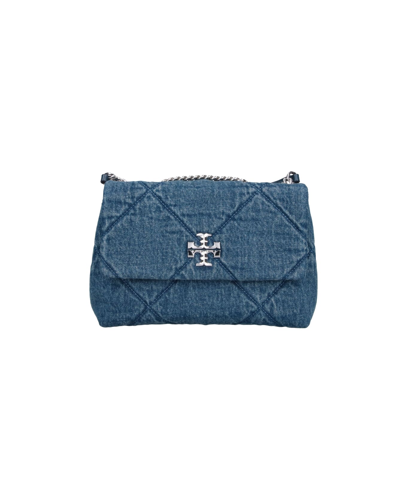 - Shoulder Bag "Kira" Tory Burch in blue cotton denim - quilted pattern - front flap closure - "Double T" logo in silver metal on the front - chain shoulder strap - one internal flat pocket - one internal zip pocket - one main internal compartment
