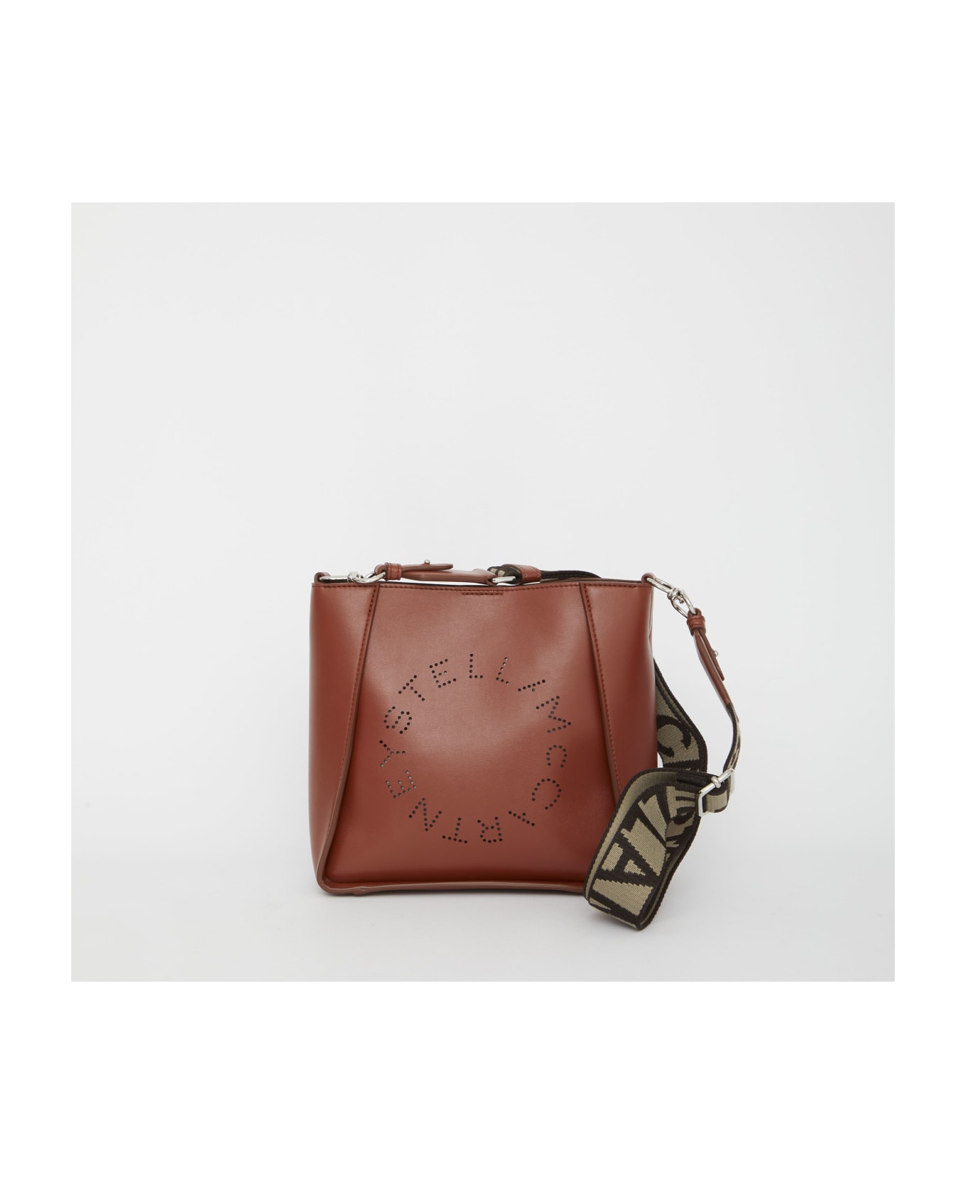 Stella Logo bag in dark red vegan fabric with Stella McCartney perforated logo on the front. It features adjustable and detachable shoulder strap in logoed fabric, press-stud closure, one main interior compartment and two interior slip pockets.