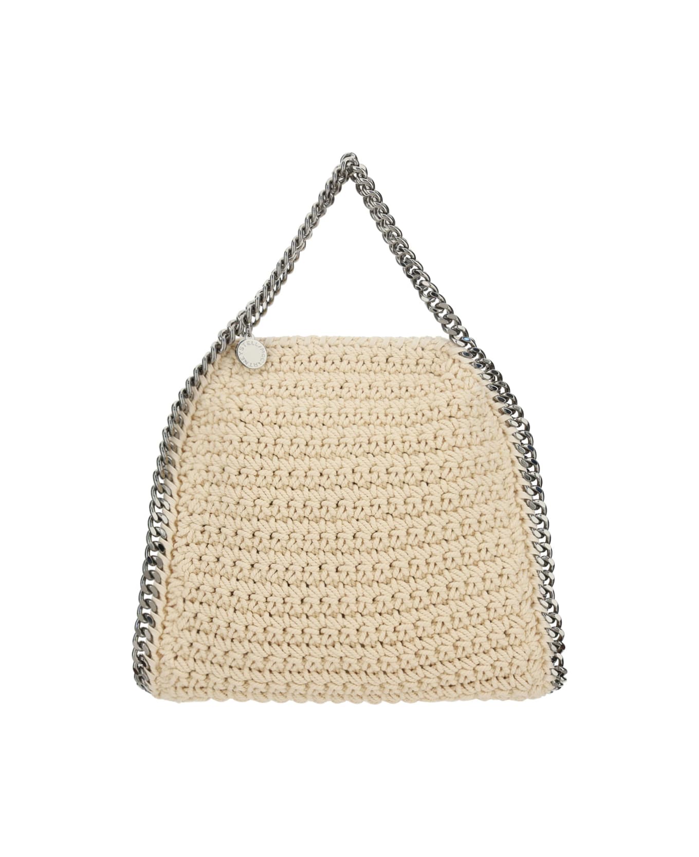 Woven Falabella Mini Tote Bag by Stella McCartney, signature diamond-cut chain-link trim, whipstitch detailing, logo charm, foldover top with magnetic fastening, two chain-link top handles, chain-link, shoulder strap, internal patch pockets, debossed internal logo, full lining.