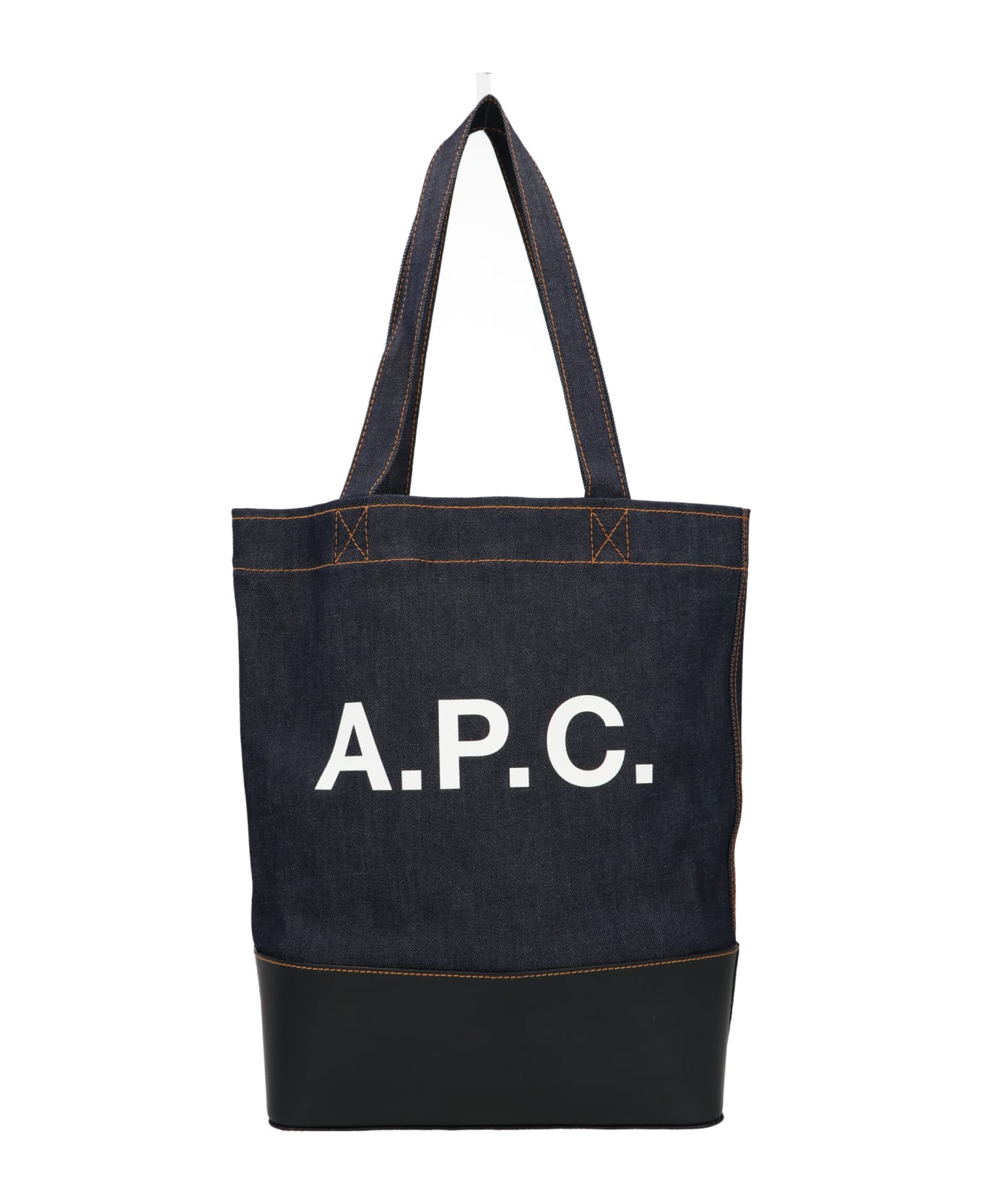 A. P. C. denim shopping bag with leather details and a logo print.
