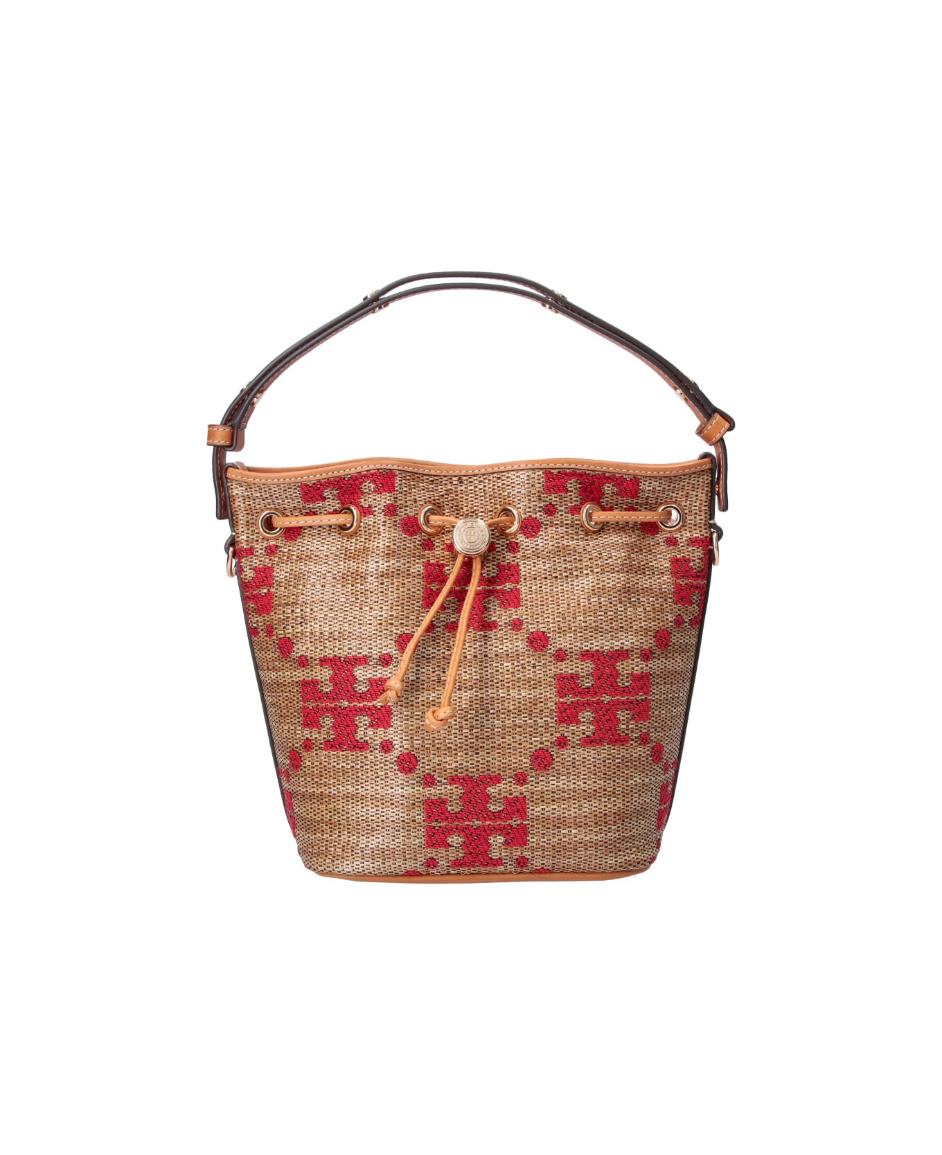 - Bucket Bag "T Monogram" Tory Burch in brown fabric - "Double T" logo all-over pattern - drawstring closure - one top handle - one removable internal zip pouch - one main internal compartment