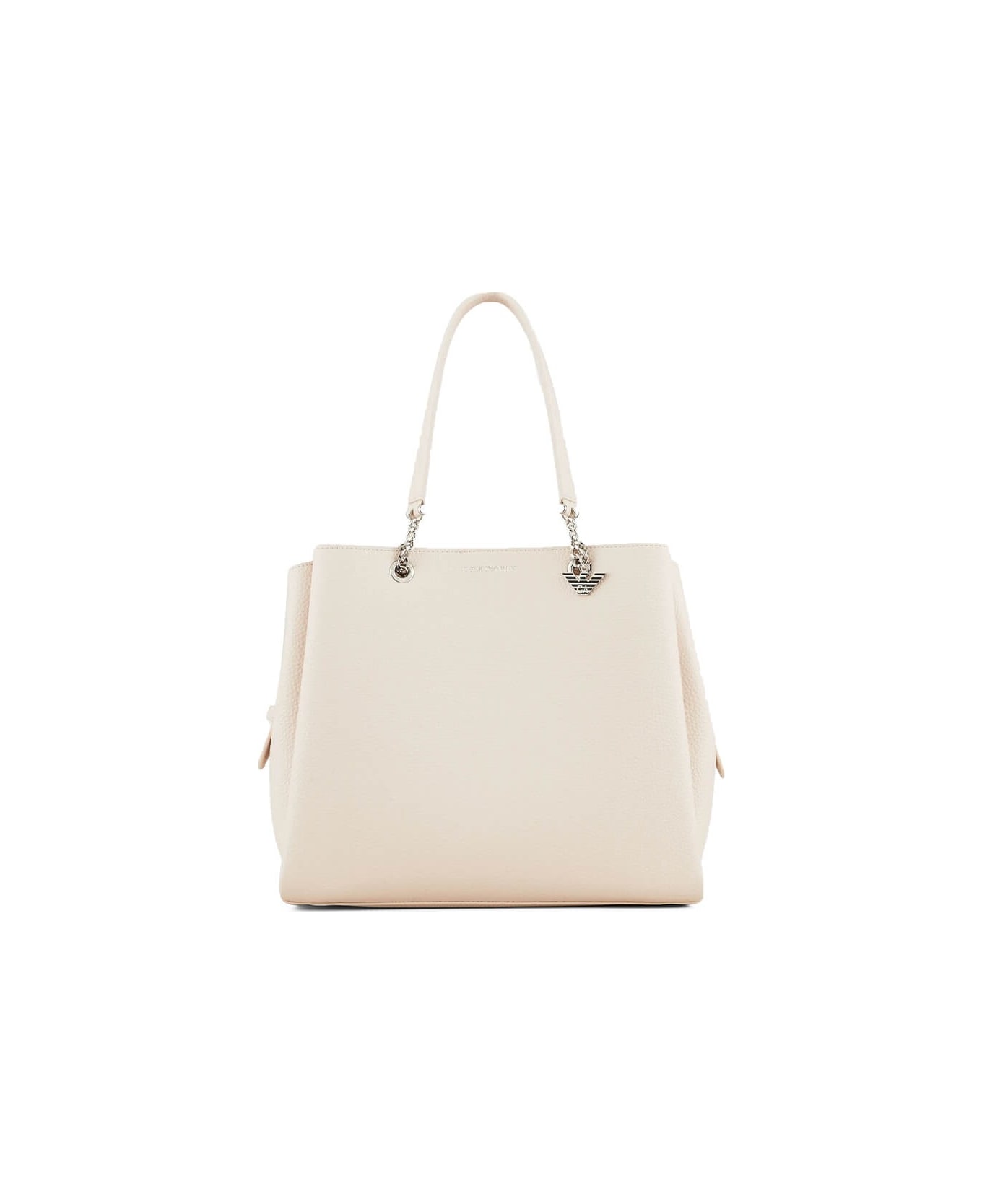 Shopping bag by Emporio Armani in cream-colored imitation leather. Front logo and charm with iconic eagle, double handle with chain insert and removable shoulder strap. Equipped with detachable internal pouch with zip and magnetic flap closure, measures 31x25x15 cm. Composition: 100% PVC - Polyvinylchloride.